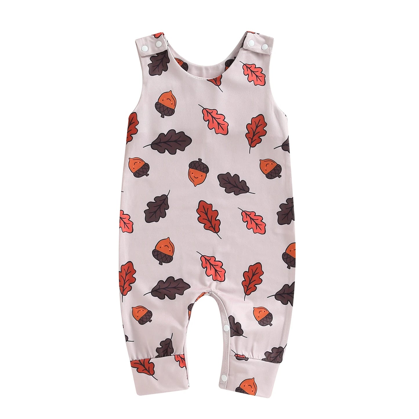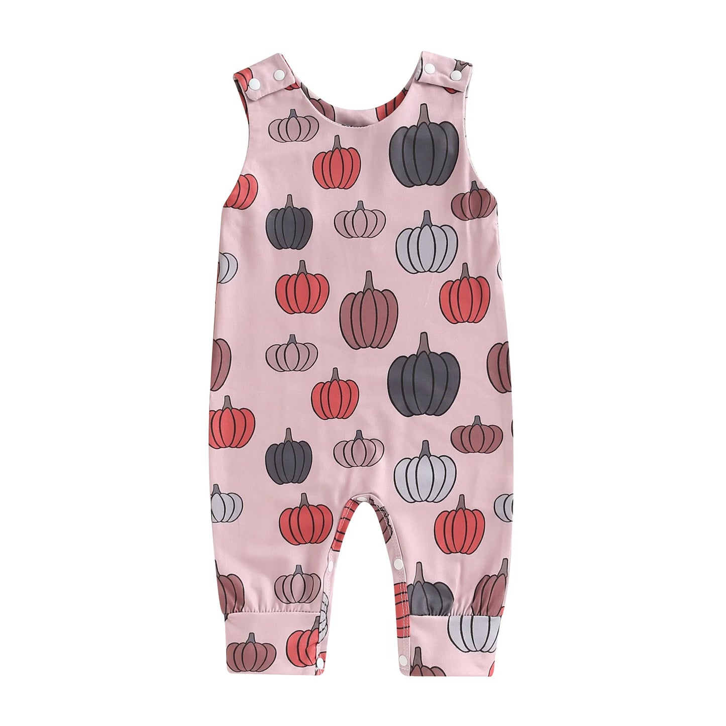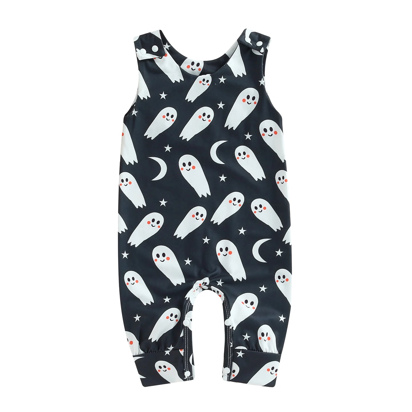 Dress your little one in festive Halloween style with our 0-18M Newborn Baby Boy Girl Halloween Jumpsuit. This adorable sleeveless romper features a crew neck design and is adorned with playful prints of pumpkins, ghosts, and leaves, perfect for the spooky season.