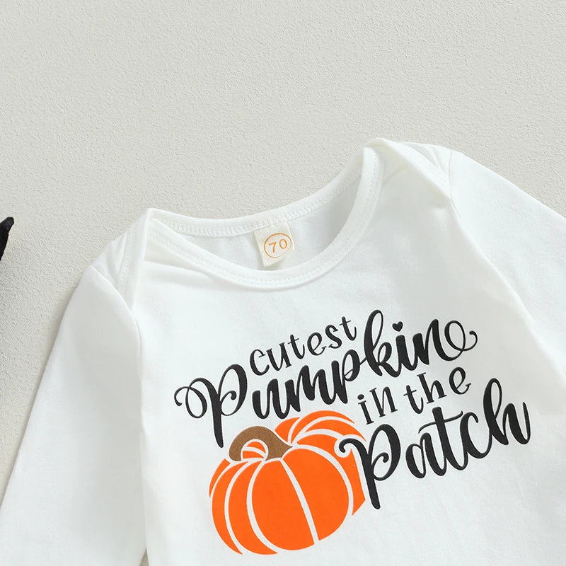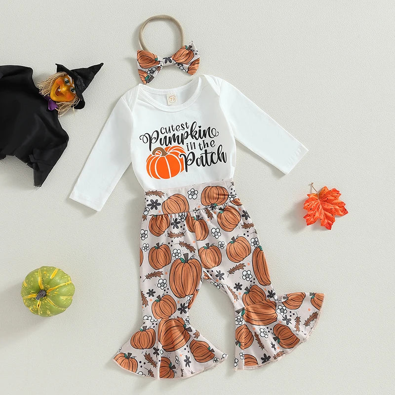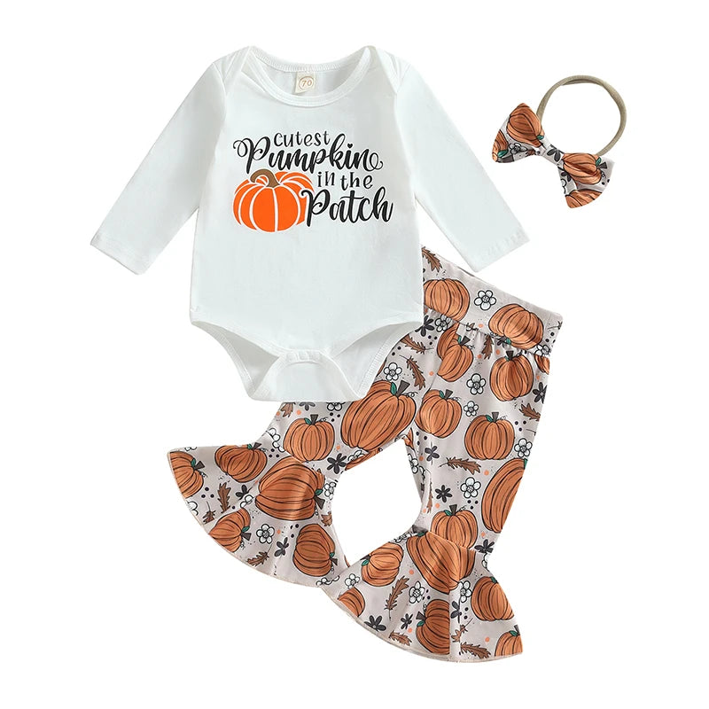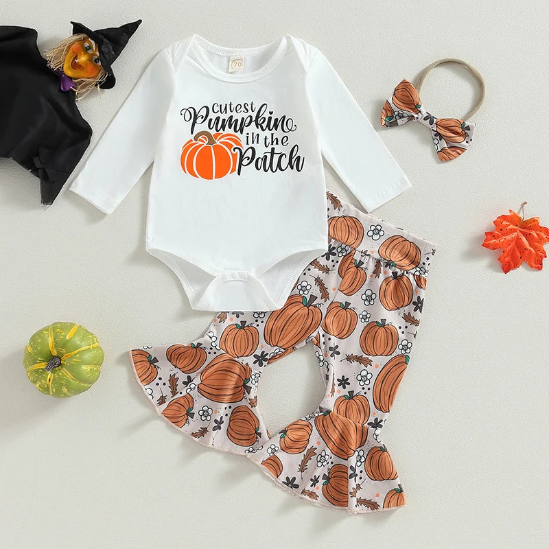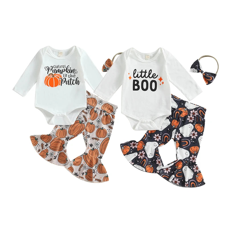 Dress your little princess in adorable Halloween style with our 0-18M Newborn Baby Girls 3Pcs Halloween Outfits. This charming set includes a long sleeve romper, flare pants, and a matching headband, perfect for adding a festive touch to your baby girl's wardrobe during the Halloween season.
