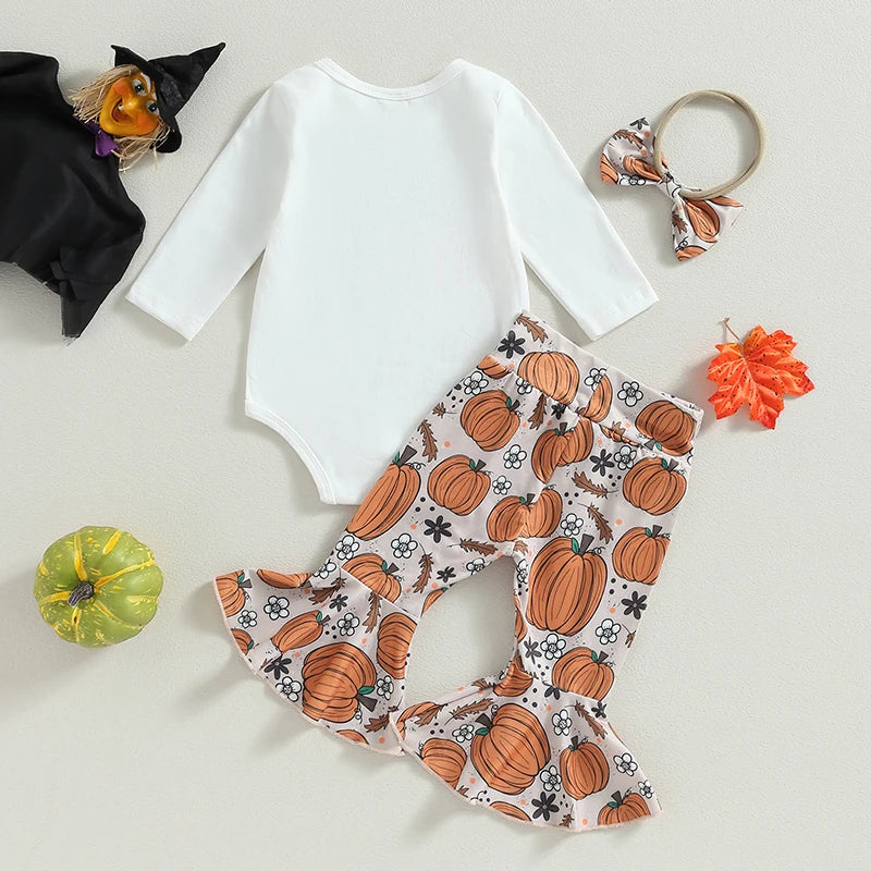 0-18M Baby Halloween Outfits - Long Sleeve Romper, Flare Pants, Headband Set