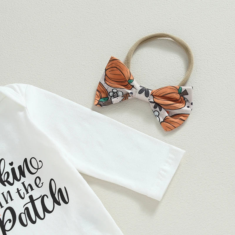 Crafted from soft and comfortable fabric, this outfit ensures your baby stays cozy and stylish during Halloween festivities. The long sleeve romper provides extra warmth, while the flare pants add a trendy flair to the ensemble. Complete with a coordinating headband, this set is perfect for capturing precious memories during this special time of year.