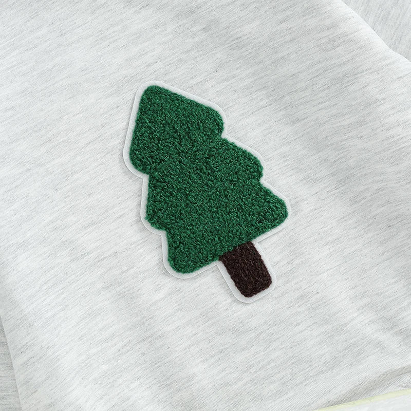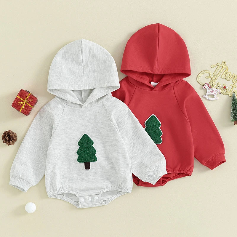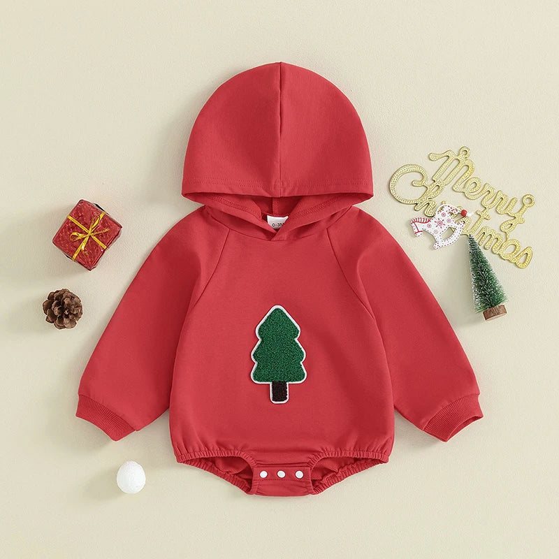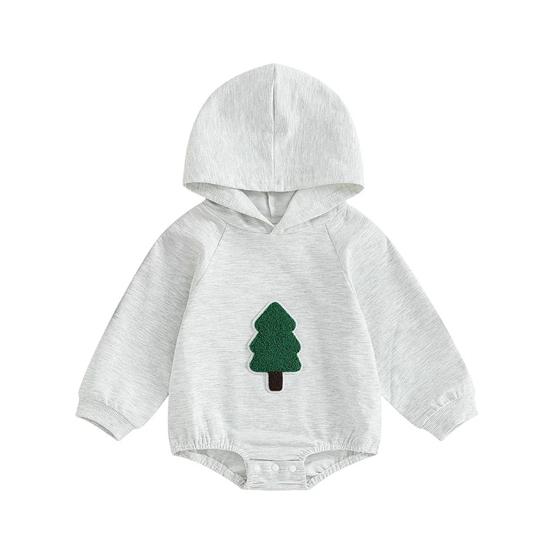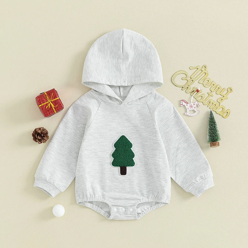 Dress your little one in festive style with this adorable infant baby Christmas outfit. The outfit features a cozy hooded romper jumpsuit adorned with a fuzzy tree print, perfect for spreading holiday cheer.
