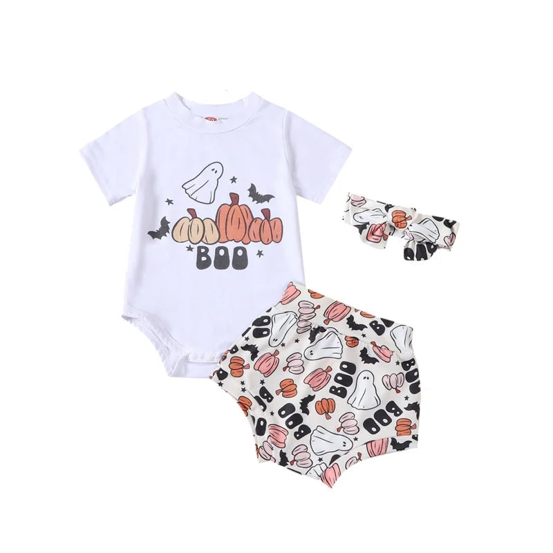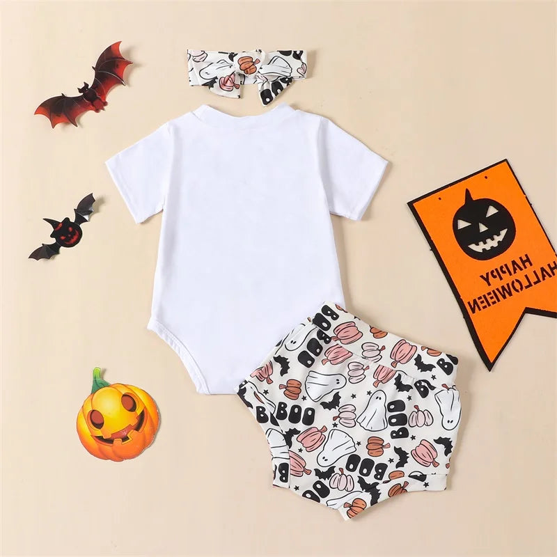 Get your little princess ready for Halloween with our Infant Baby Girl 3Pcs Halloween Jumpsuit Outfits. This adorable ensemble includes a short sleeve romper featuring pumpkin and ghost prints, paired with matching shorts, perfect for adding a festive touch to your baby's wardrobe during the Halloween season.