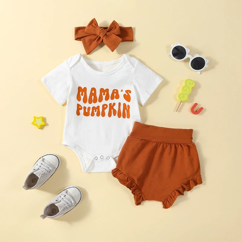 Get your little one ready for Halloween with our 0-24M Baby Halloween Shorts Sets. This adorable ensemble includes a white romper with letter print, paired with ruffle shorts and a matching headband, perfect for adding a festive touch to your baby's wardrobe during the Halloween season.