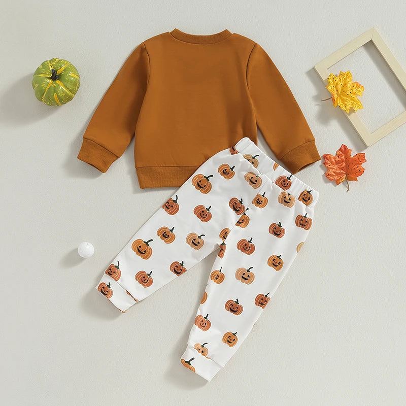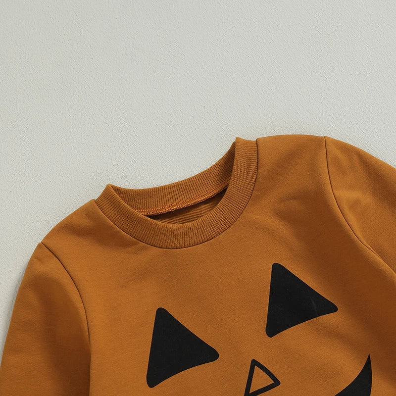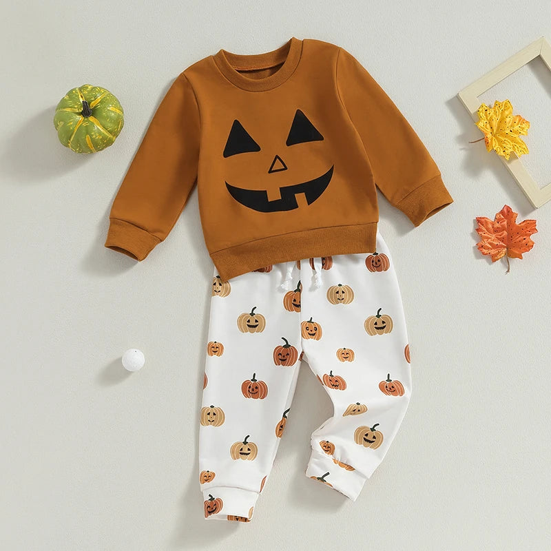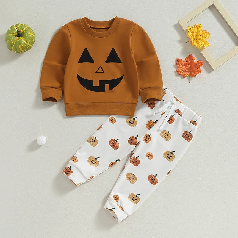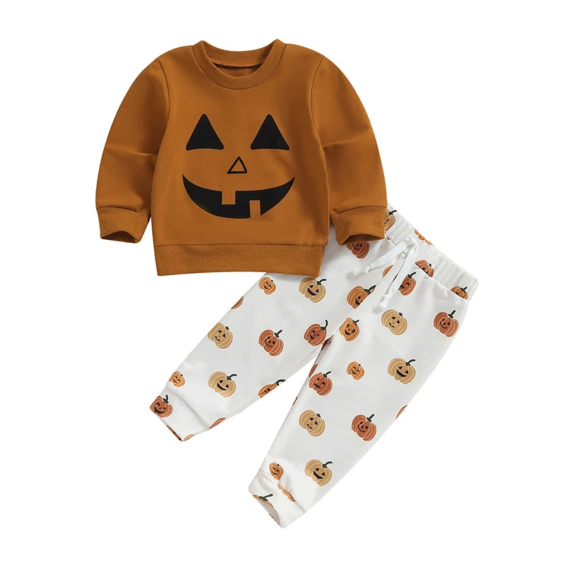 Crafted from soft and comfortable fabric, these outfits ensure your little one stays cozy and stylish during Halloween festivities. The pumpkin face print adds a cute and playful element to the ensemble, making it perfect for celebrating the spooky season.