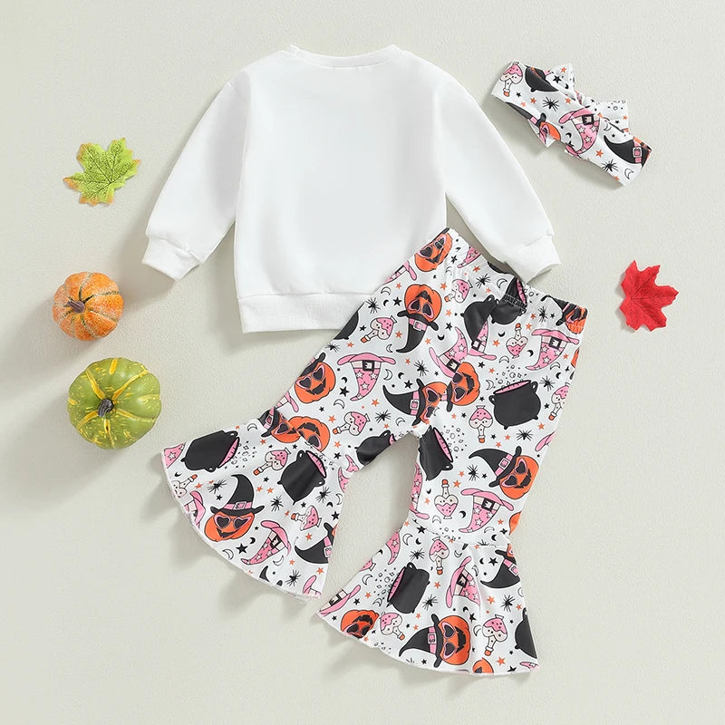 0-4Years Halloween Outfit Set - Letters Print Sweatshirt, Pumpkin Print Flare Pants, Headband