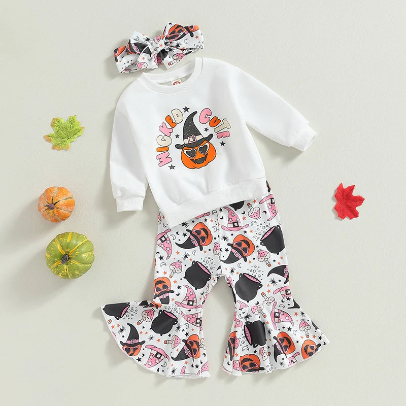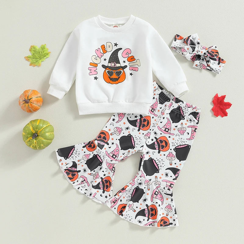 Get your little one ready for Halloween with our charming 0-4Years Halloween Outfit Set. This set includes a cozy sweatshirt adorned with playful letter prints, complemented by adorable pumpkin print flare pants and a matching headband.
