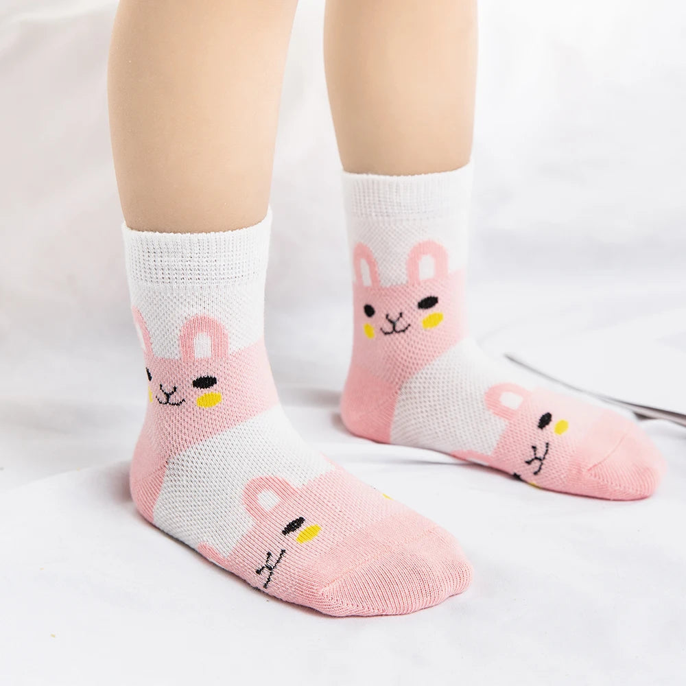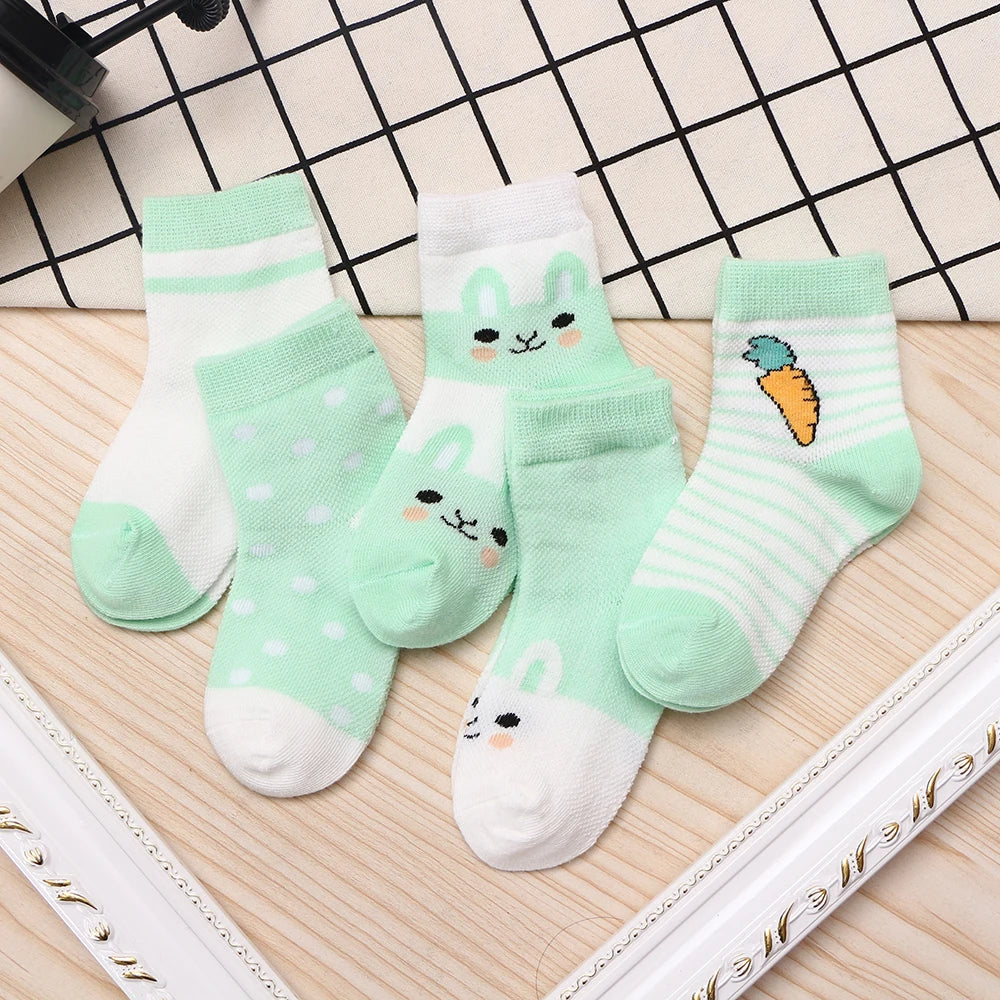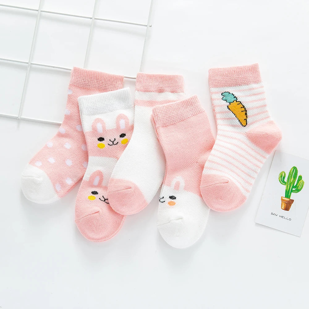 Each pair features a playful cartoon animal design, with cute carrots adorning the girls' mesh socks. The set includes 5 pairs of socks suitable for kids aged 0 to 9 years old, making them ideal for newborns, toddlers, and older children alike.