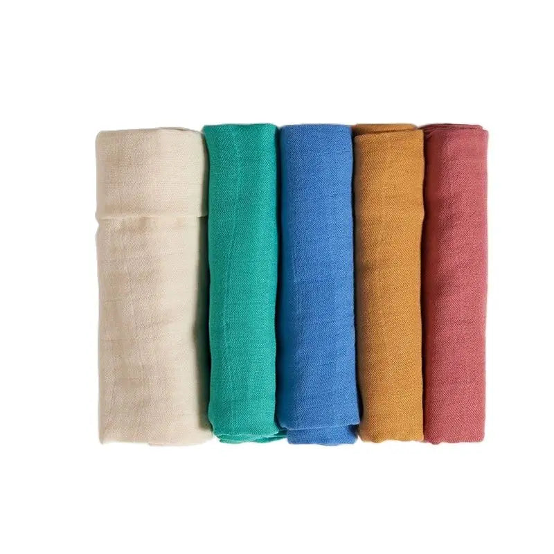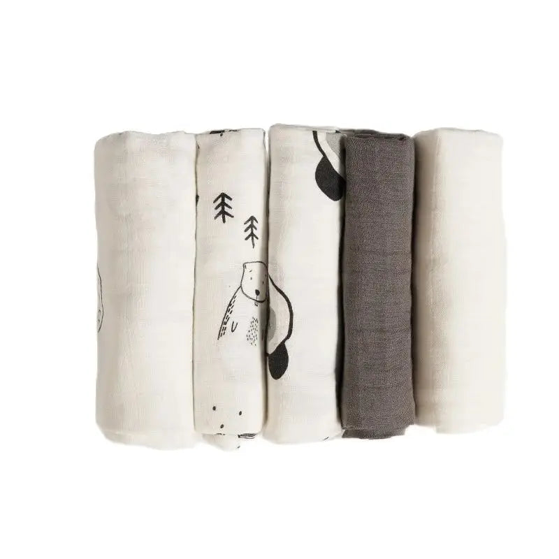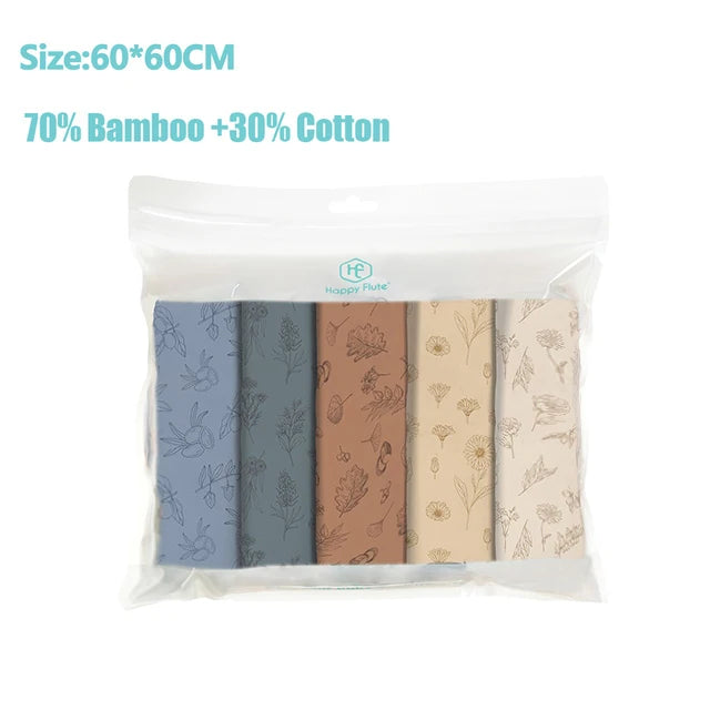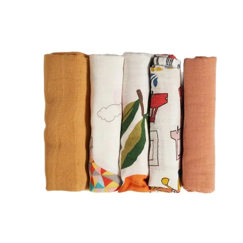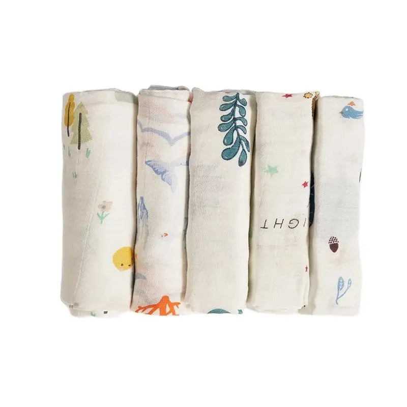 Introducing our 5Pcs/Set of 60x60cm Super Soft Muslin Swaddle and Burp Cloth. Crafted from a blend of soft bamboo cotton, these versatile cloths offer gentle care for your newborn's delicate skin.