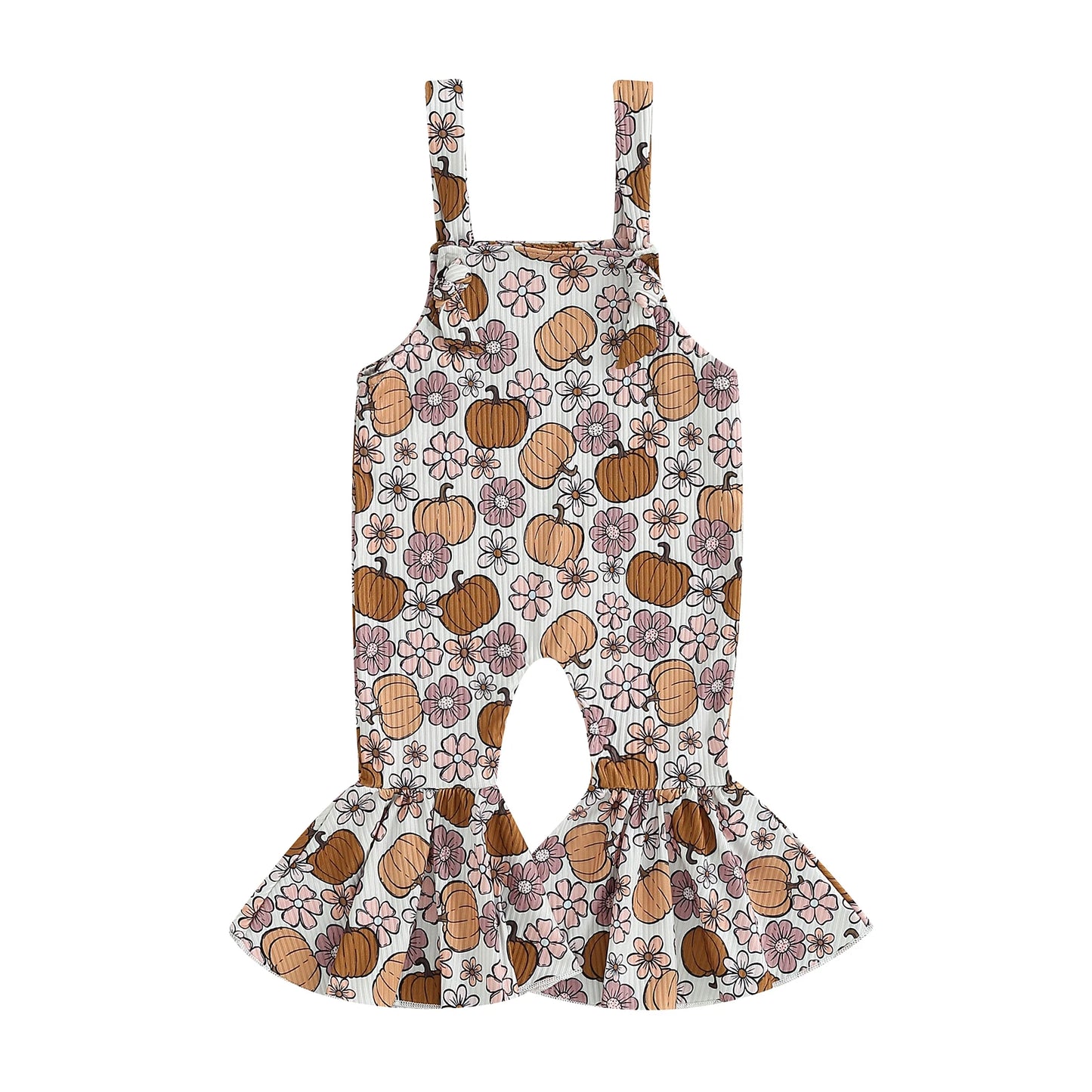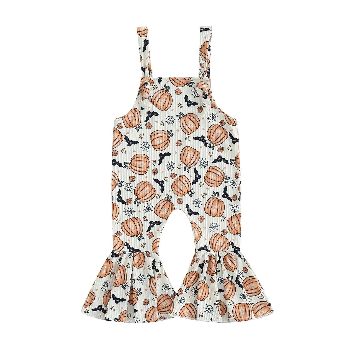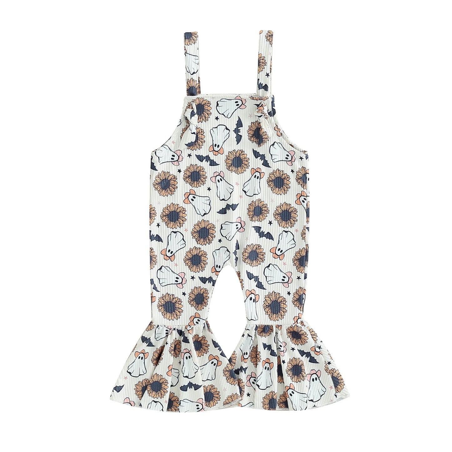 9M-3Y Baby Halloween Jumpsuit - Flowers, Pumpkin, Spider Web Print Sleeveless Romper Bell-Bottoms