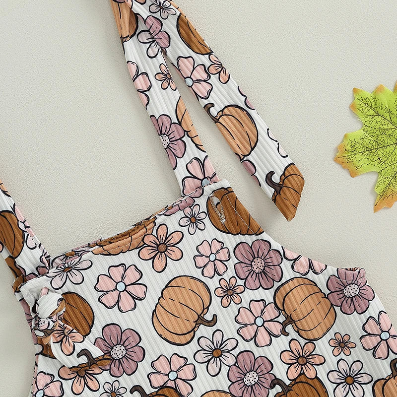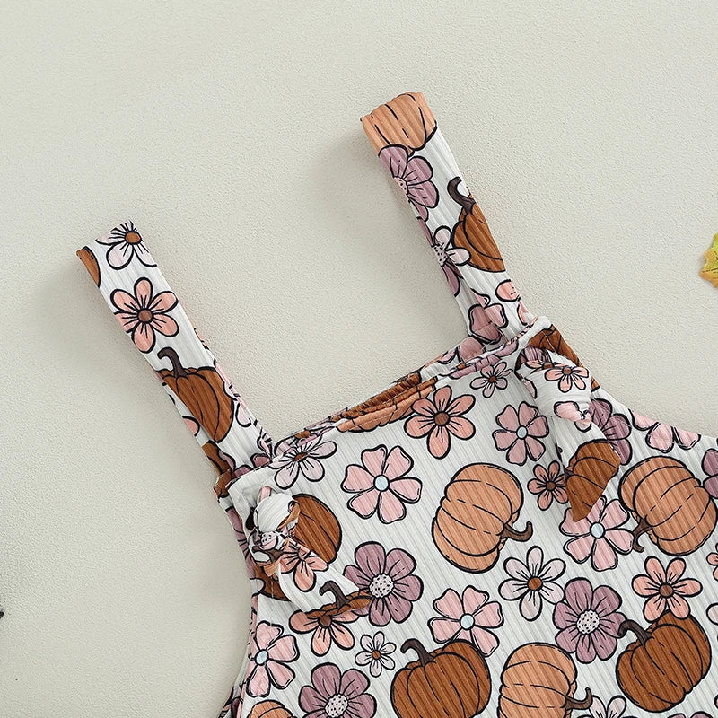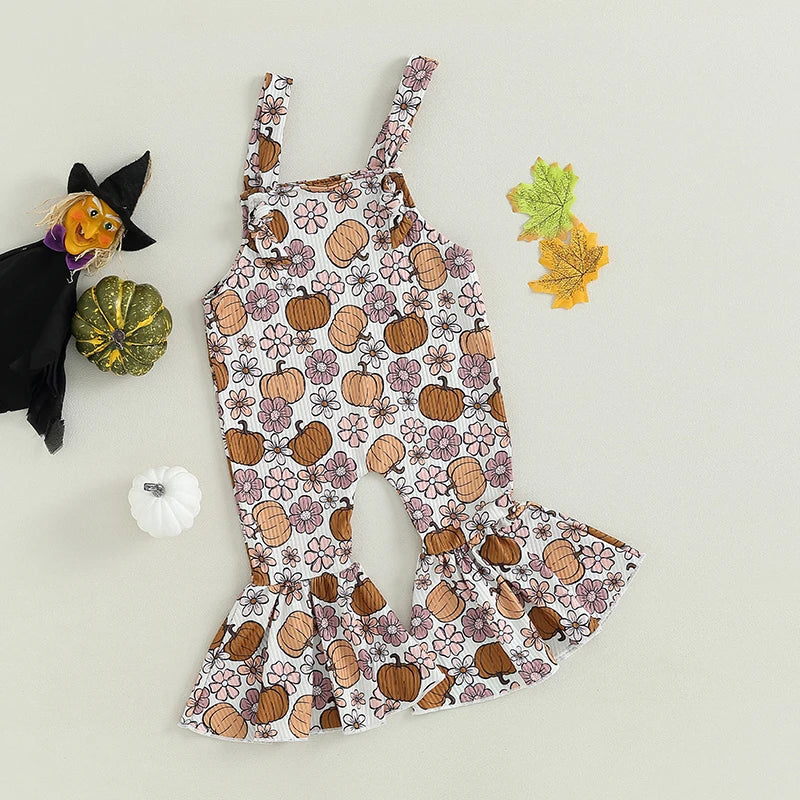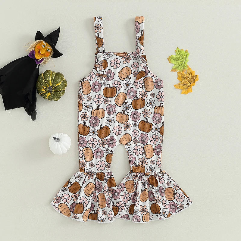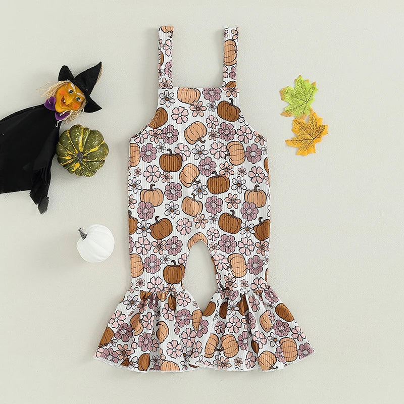 9M-3Y Baby Halloween Jumpsuit - Flowers, Pumpkin, Spider Web Print Sleeveless Romper Bell-Bottoms