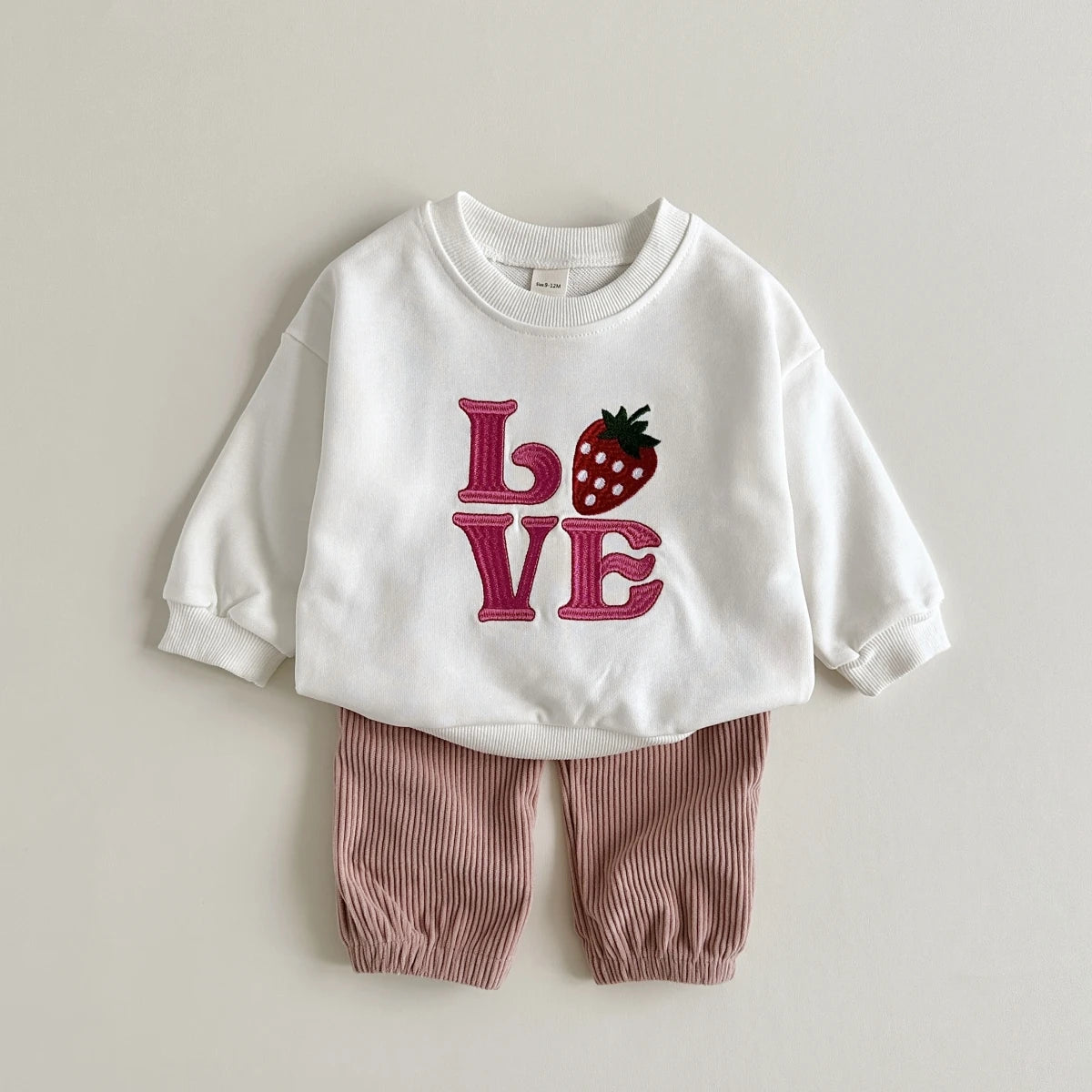 Featuring embroidered fruit sweaters, this tracksuit set adds a playful touch to your child's wardrobe. Paired with comfortable corduroy pants, this outfit ensures your baby stays warm and stylish.