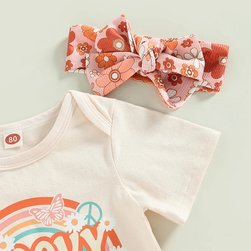 Baby 2-Piece Summer Set: Short Sleeve Letters Rainbow Print Romper & Floral Flare Pants