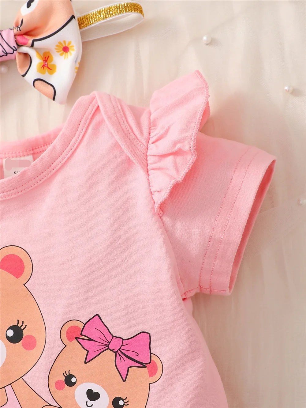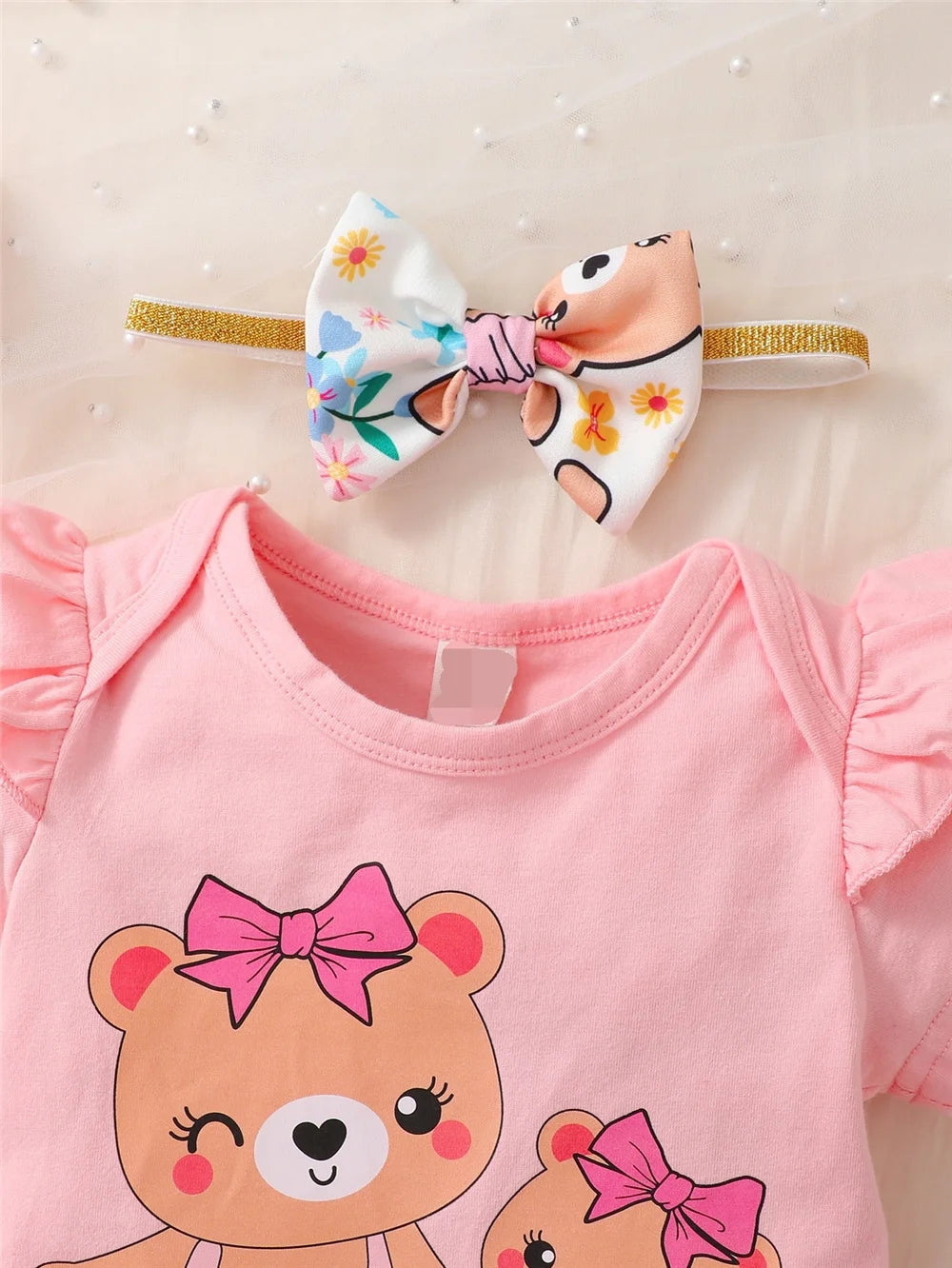 Baby Boy 4PCS Bear Print Clothing Set - Short Sleeve Bodysuit, Pants, Hat, Sock