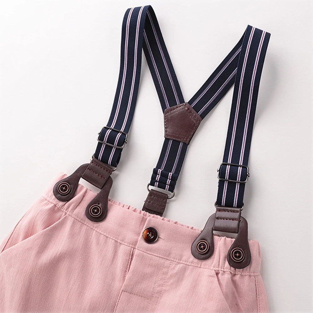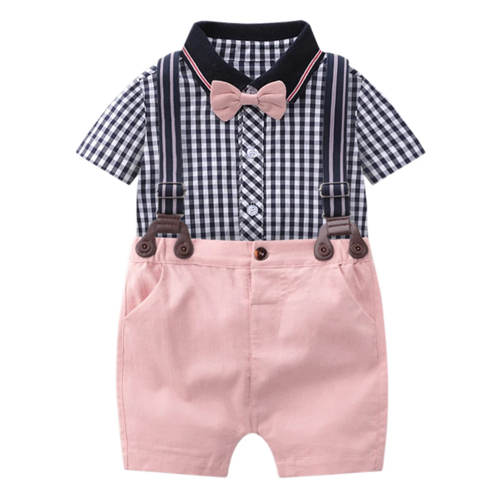 Dress your little gentleman in charming style with our Baby Boy Formal Plaid Romper Overalls. This adorable outfit features a classic plaid romper in pink hues, complemented by stylish overalls, perfect for your baby boy's 1st or 2nd birthday party.