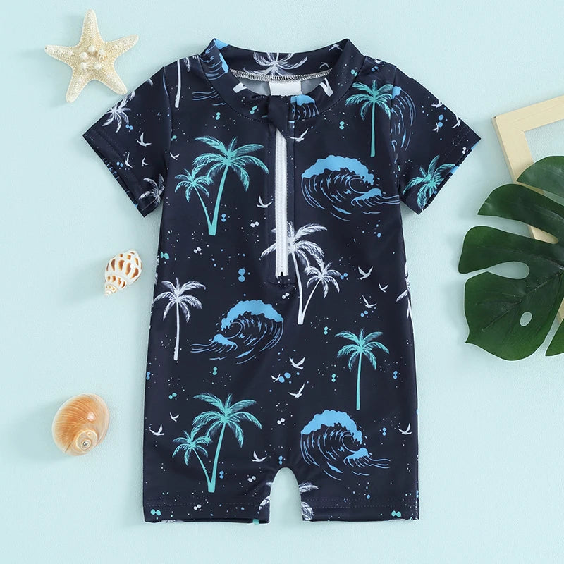 Baby Boy Swimsuit Rash Guard Shirt, Bathing Suit Short Sleeve Zip-Up Sunsuit Swimwear