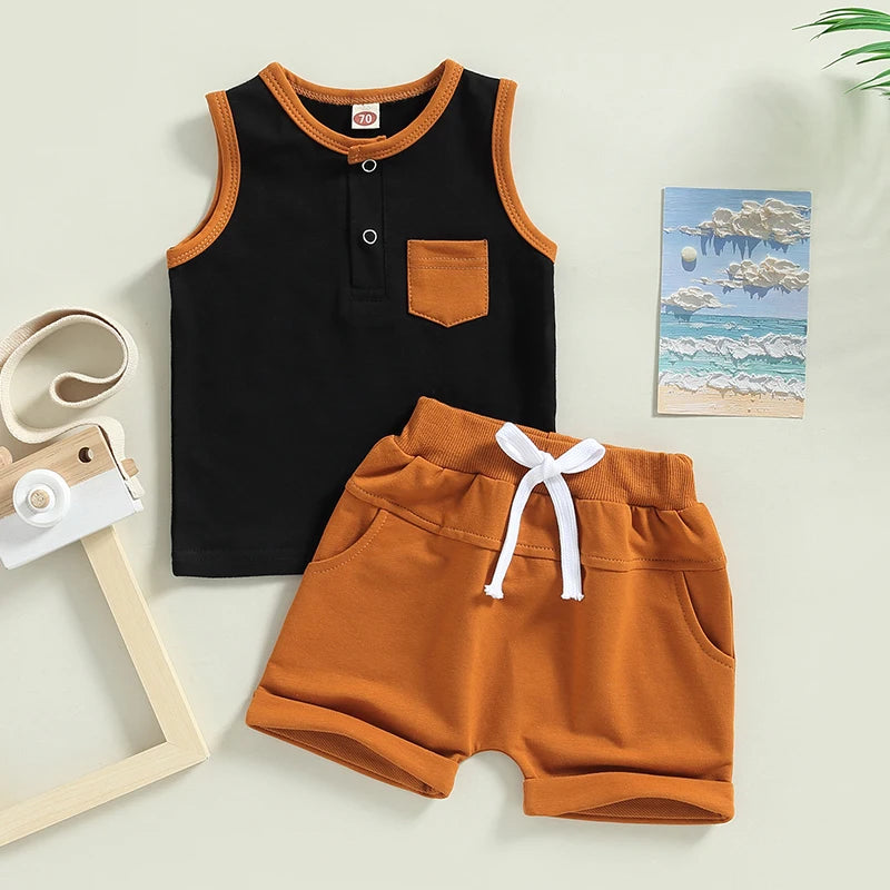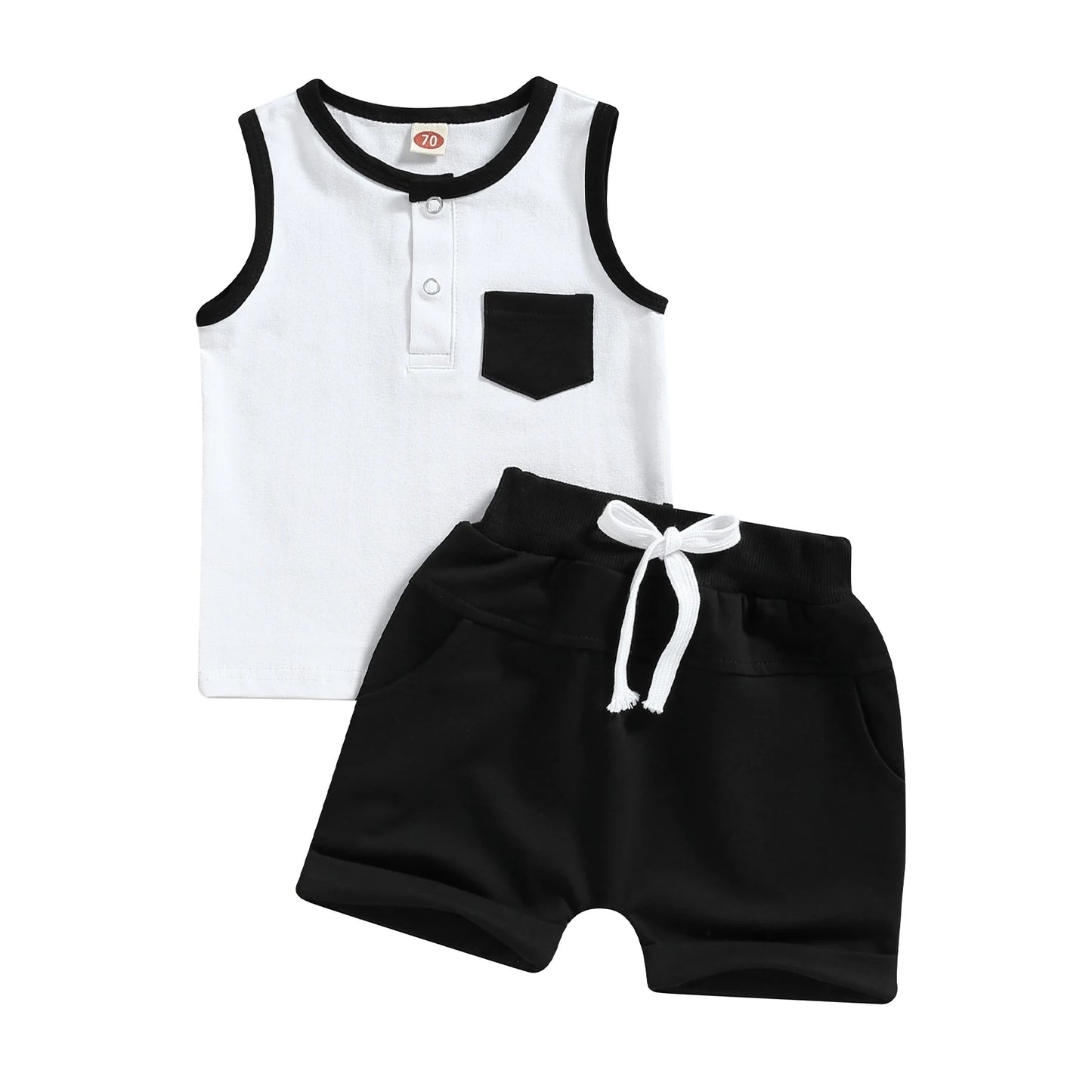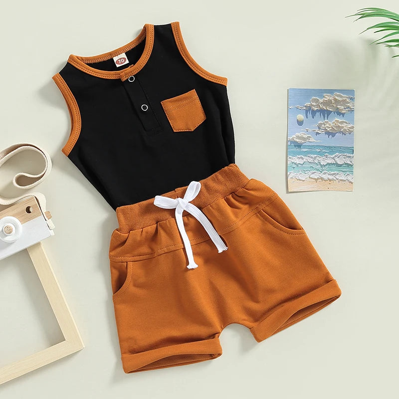 Dress your little guy in style with this adorable 2-piece shorts set designed for baby kids boys. The ensemble includes a contrast color tank top paired with elastic waist shorts, perfect for warm weather adventures. Crafted for comfort and fashion, this outfit ensures your little one stays cool and stylish all day long.
