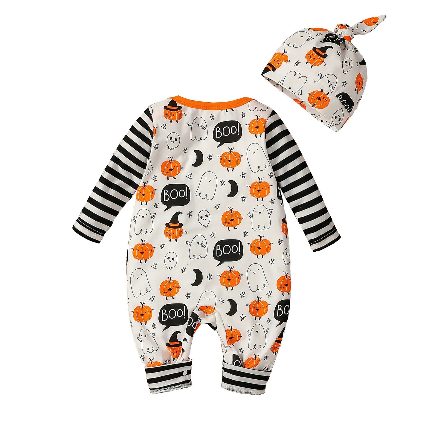 Baby Clothes Cartoon Pumpkin Romper Jumpsuit Hat Set - Halloween Costume