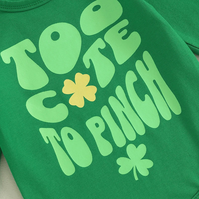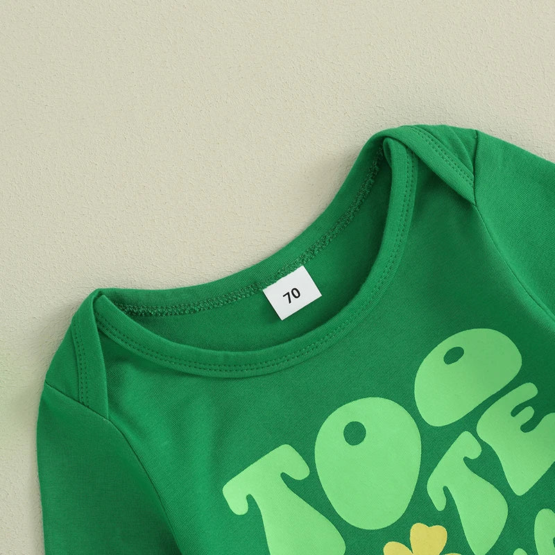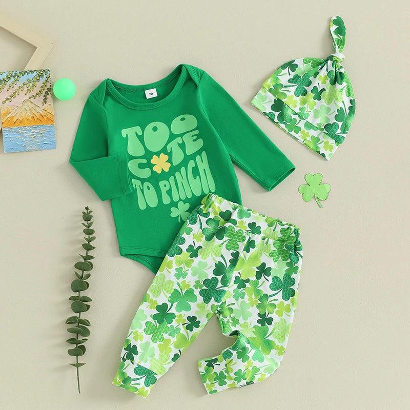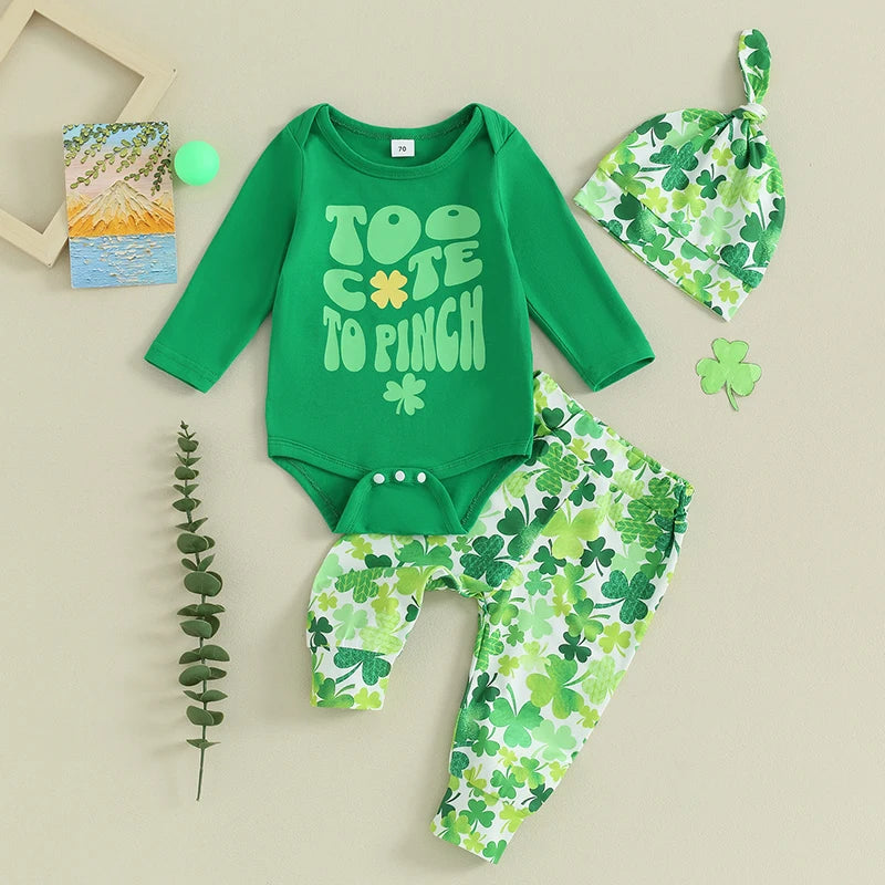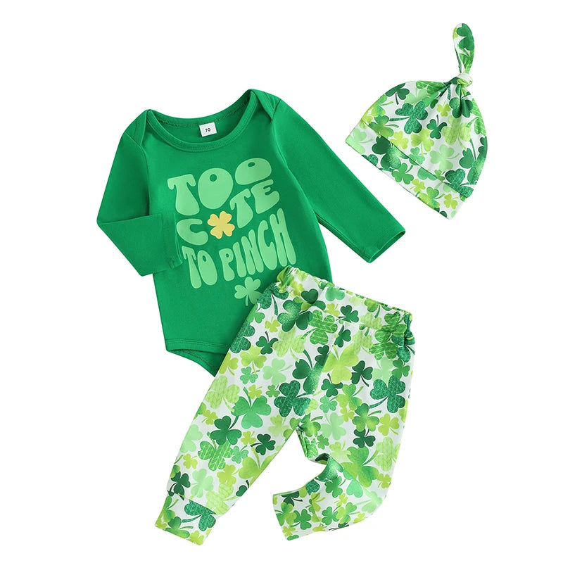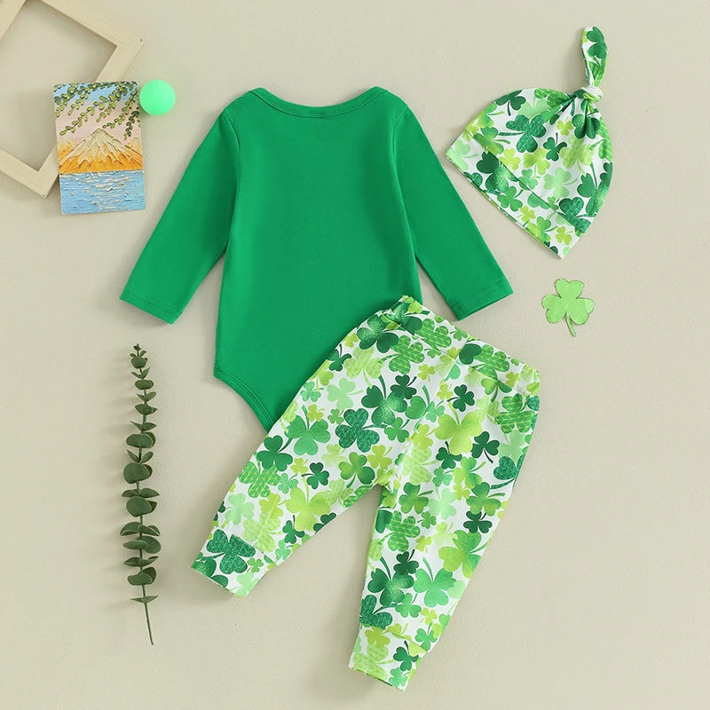 Dress your little boy in adorable style with our Baby Boys Clothes Set. This charming ensemble includes a long sleeve romper with letters print, complemented by shamrock print pants and a matching hat, creating a complete outfit for your baby boy.