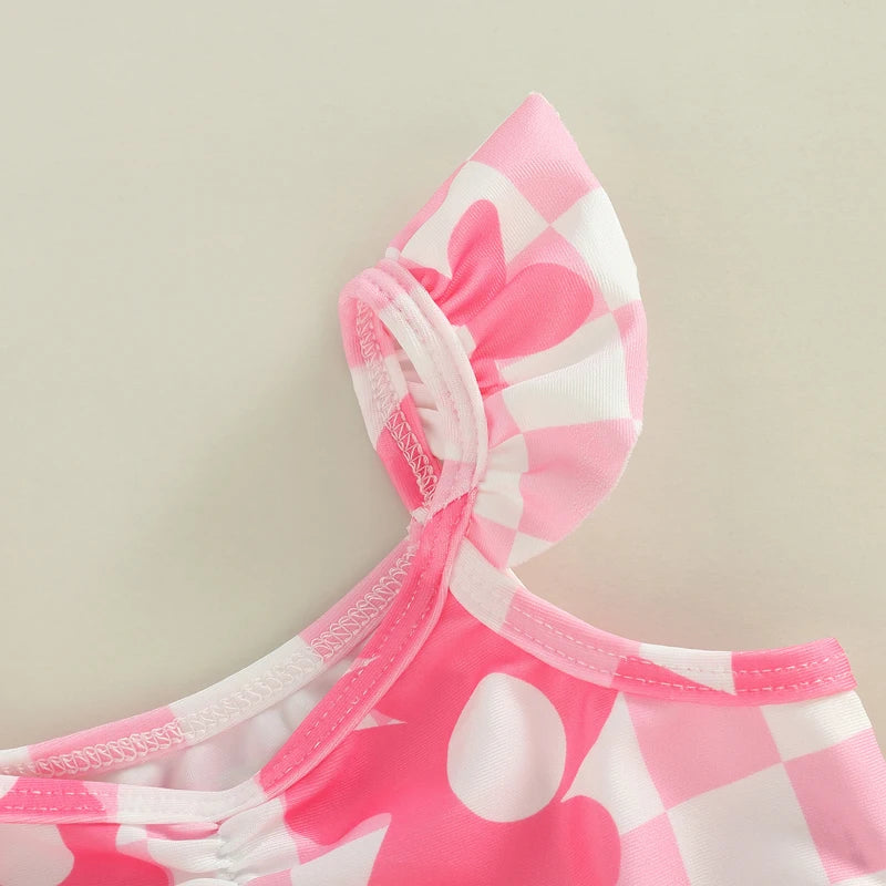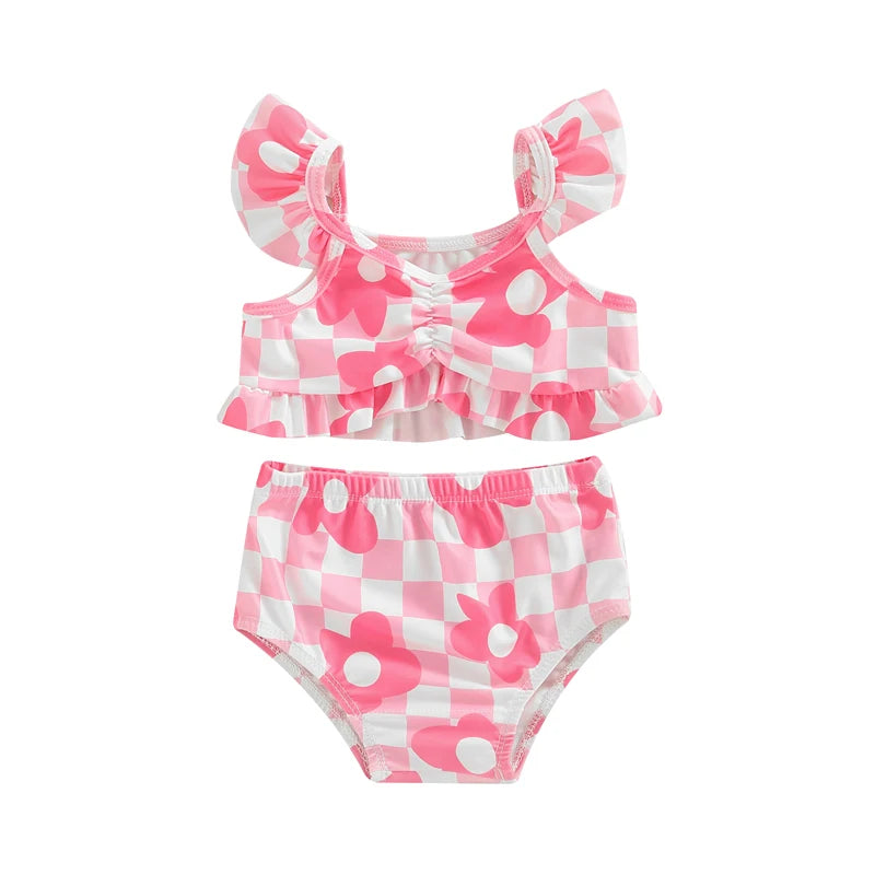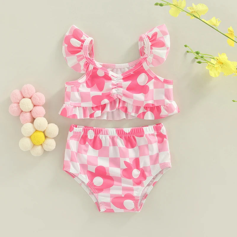 Baby Girls' 2-Piece Bikini Set: Plaid Flower Print Fly Sleeve Camisole with Briefs Bathing Swimsuit