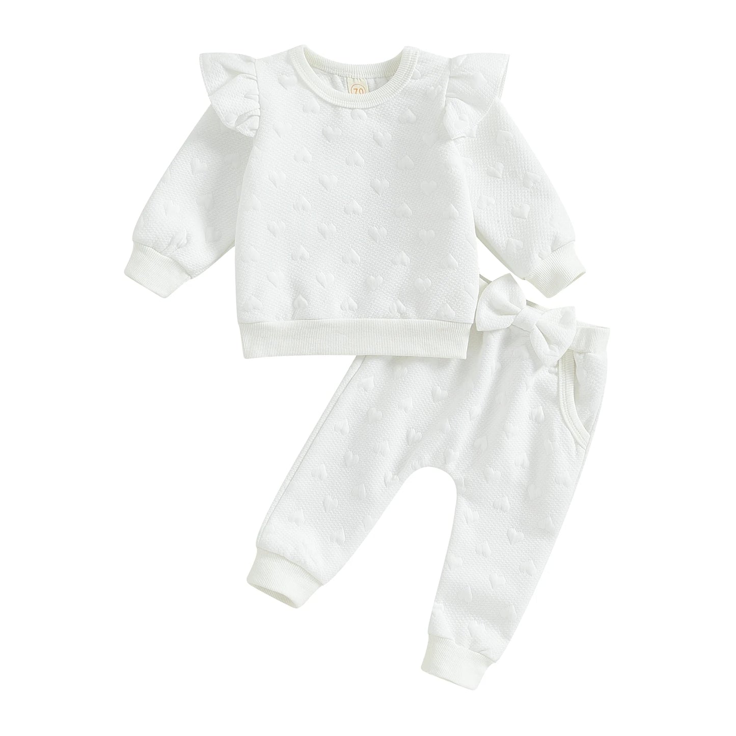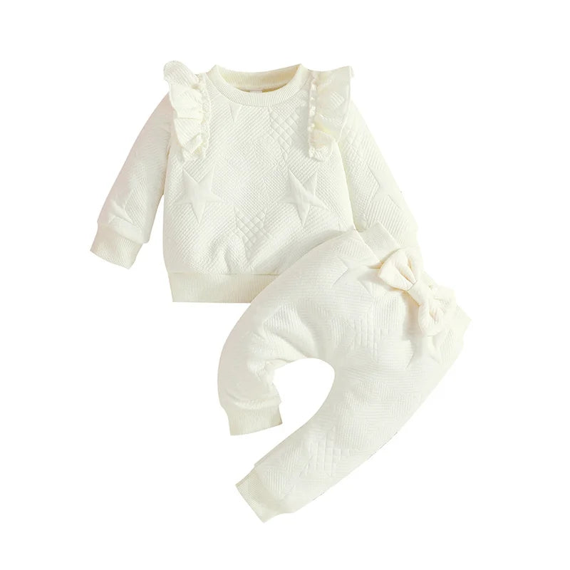 Baby Girls 2-Piece Set: Solid Color Ruffled Long Sleeve Tops + Bowknot Trousers