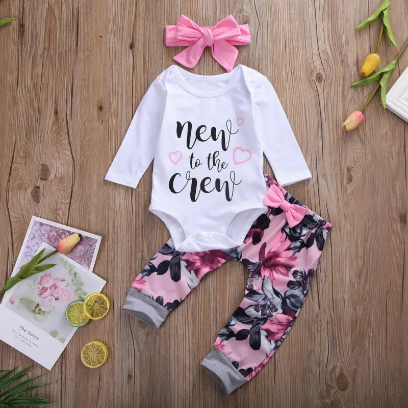 Baby Girls 3-Piece Clothes Set Floral Print Romper, Long Pants, and Headband