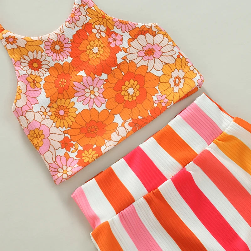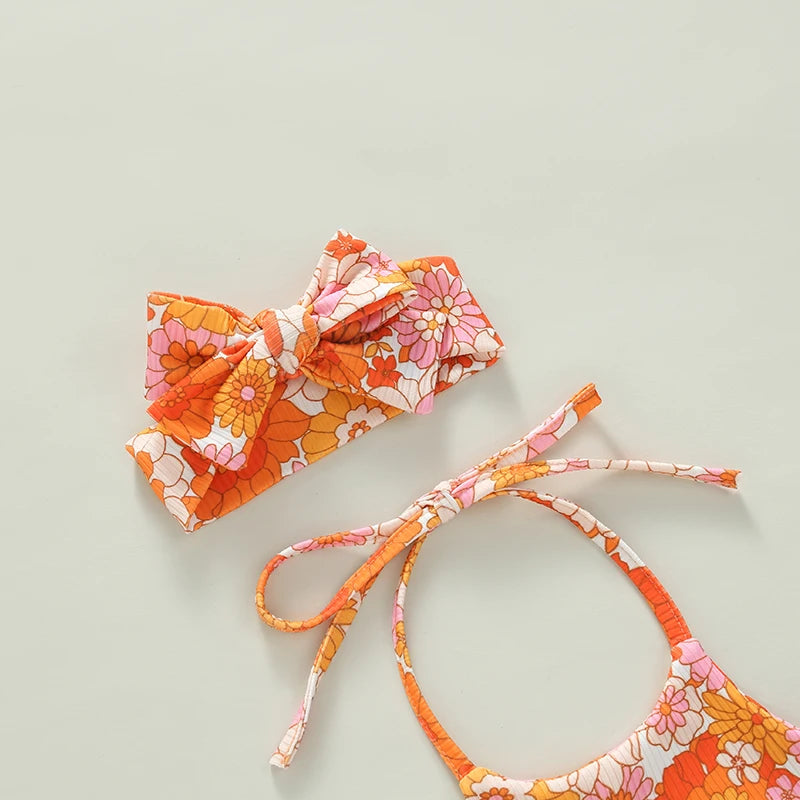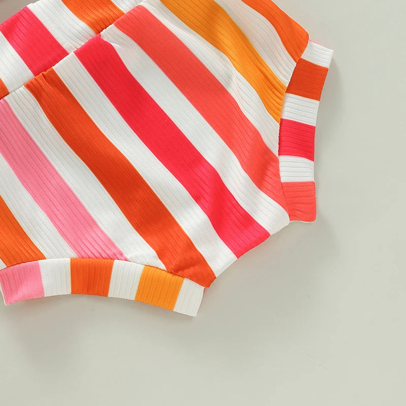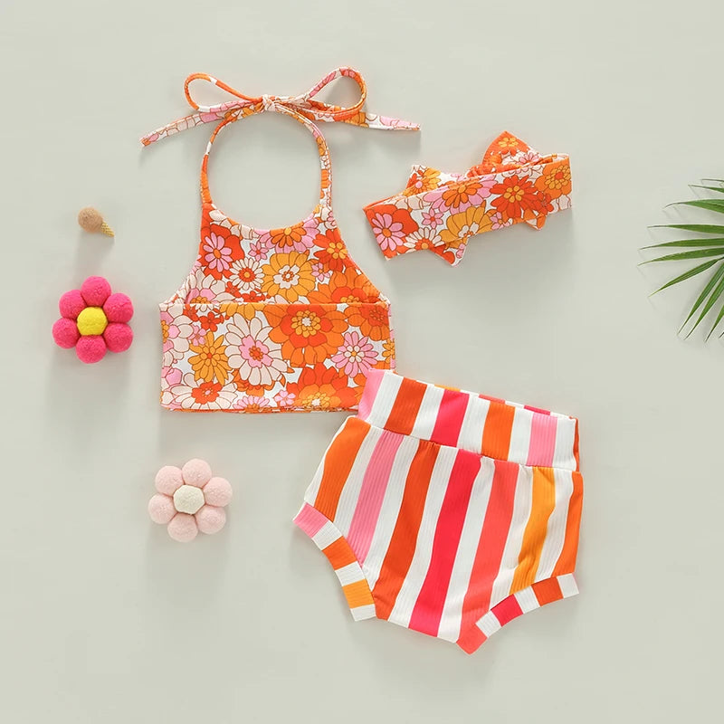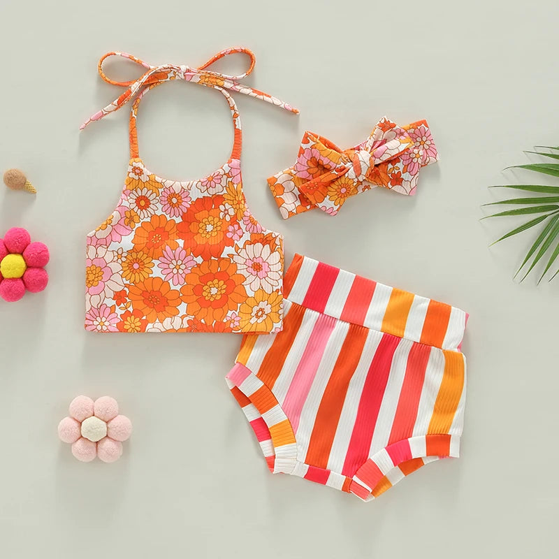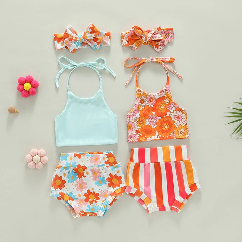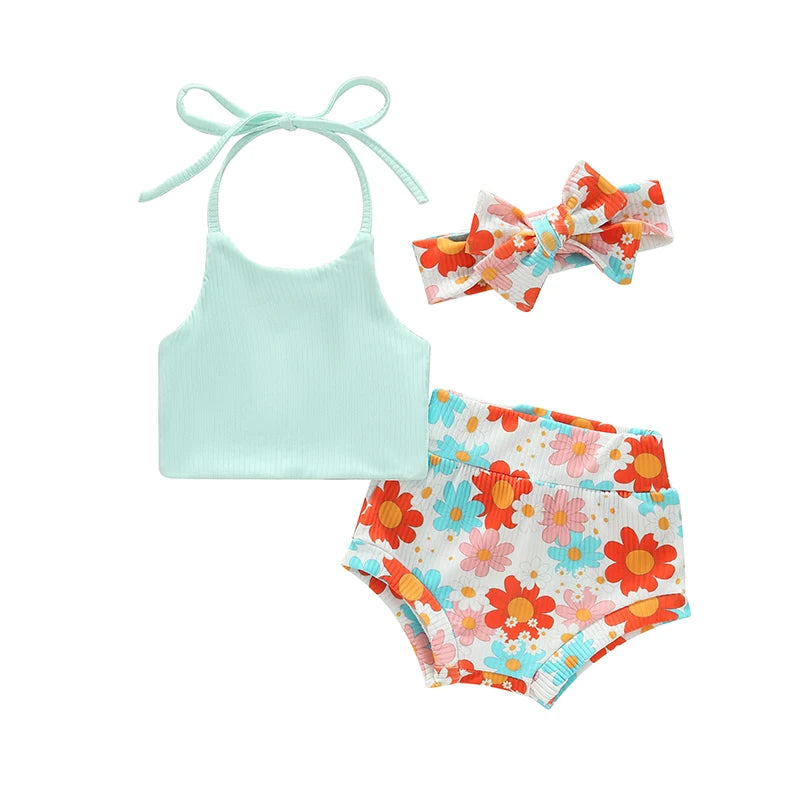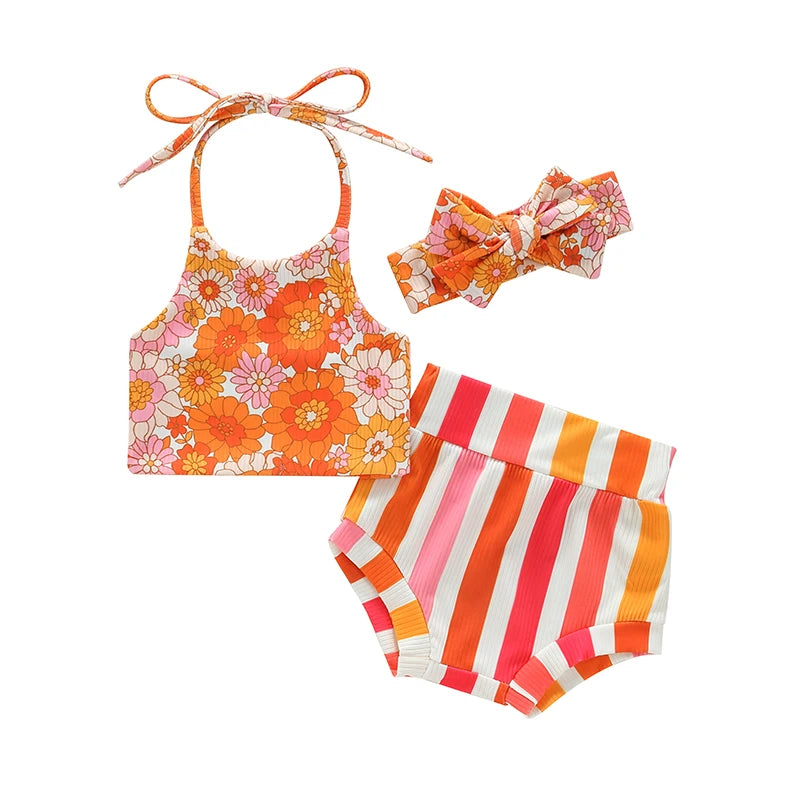 With its mix-and-match possibilities, this 3-piece outfit offers endless options for creating adorable summer looks. Elevate your baby girl's wardrobe with our Bandage Halter Sleeveless Tops, Striped/Floral Shorts, and Headband Set and make every summer day a fashionable adventure!