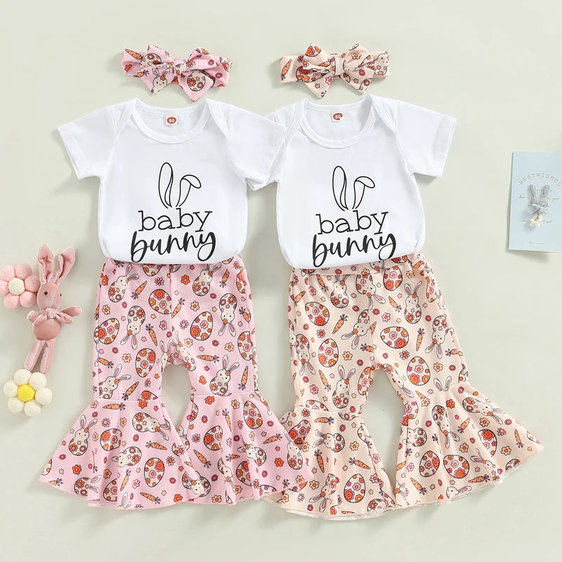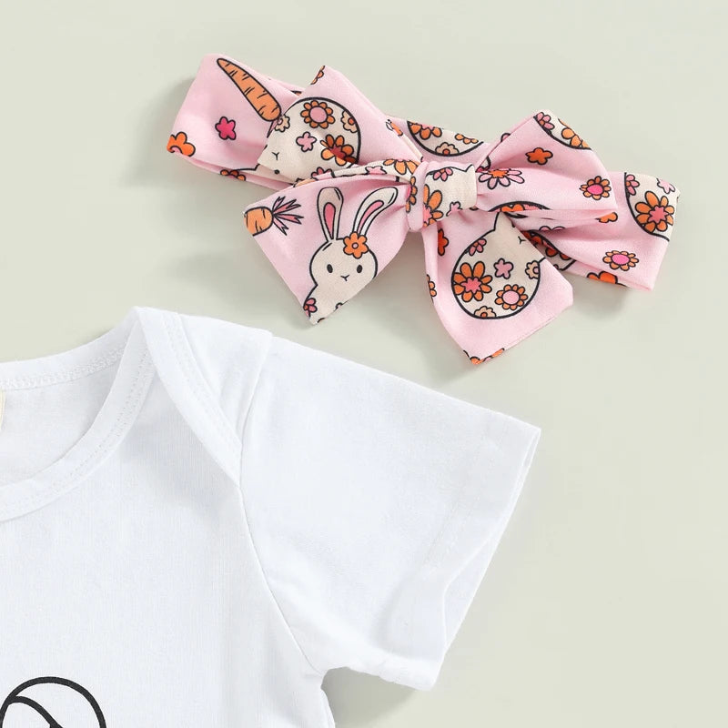 Baby Girls Easter Outfit Sets: Short Sleeve Letter Print Romper, Rabbit Egg Print Flared Pants, Headband