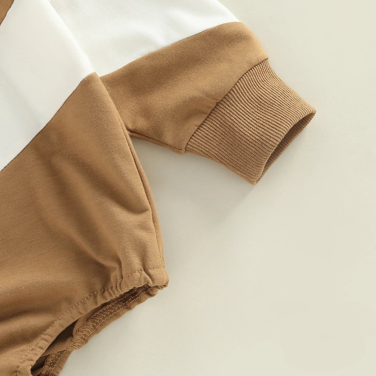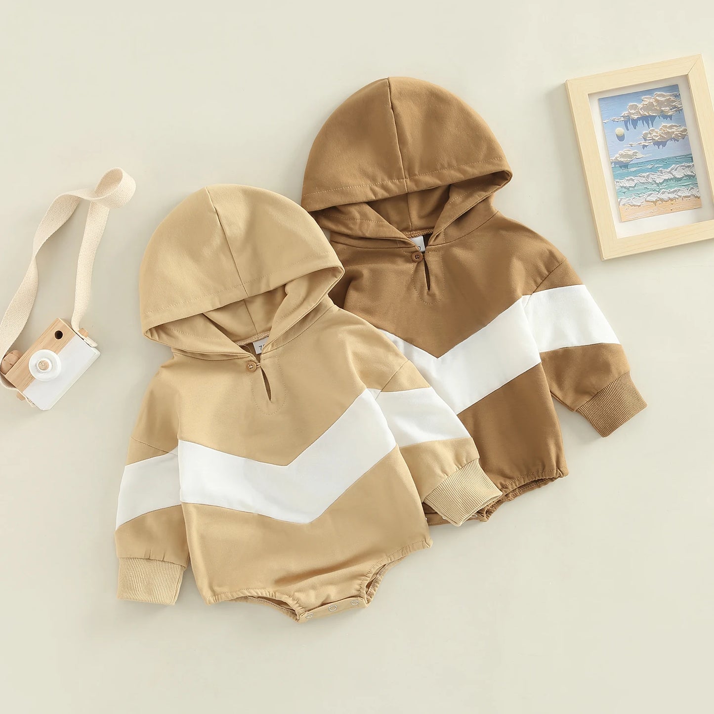 Baby Hooded Bodysuit: Patchwork Long Sleeve Loose Fit Jumpsuit
