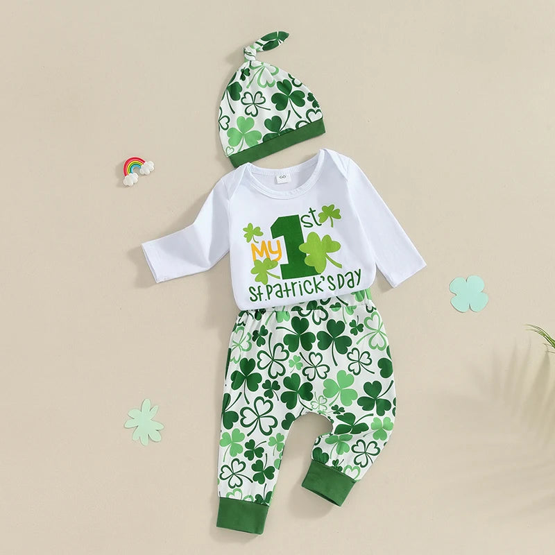 Dress your baby boy in adorable Irish style with our Baby Boy Irish Outfit. This charming set features shamrock print long sleeve rompers paired with elastic pants and a matching beanie, perfect for embracing the holiday spirit in comfort and style during the spring season.