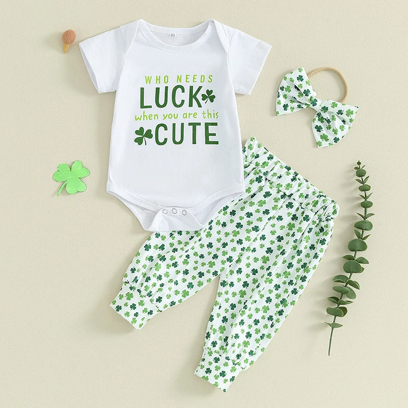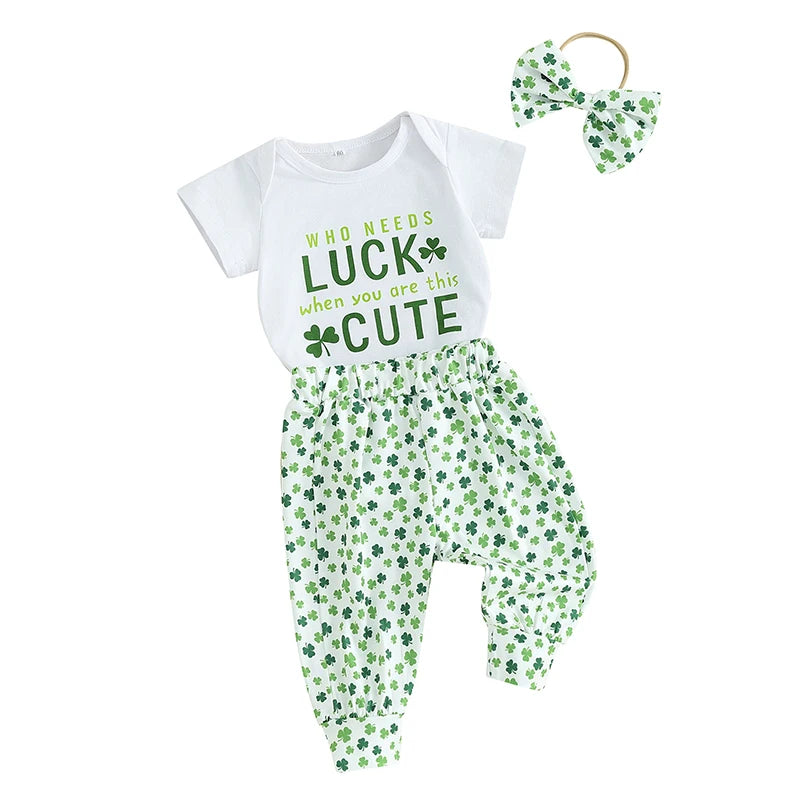 Baby Irish Set - Letter Print Short Sleeve Romper and Shamrock Print Pants Headband Outfit (3-12 Months)