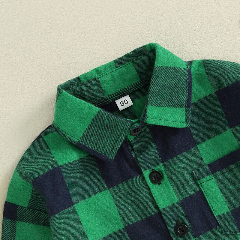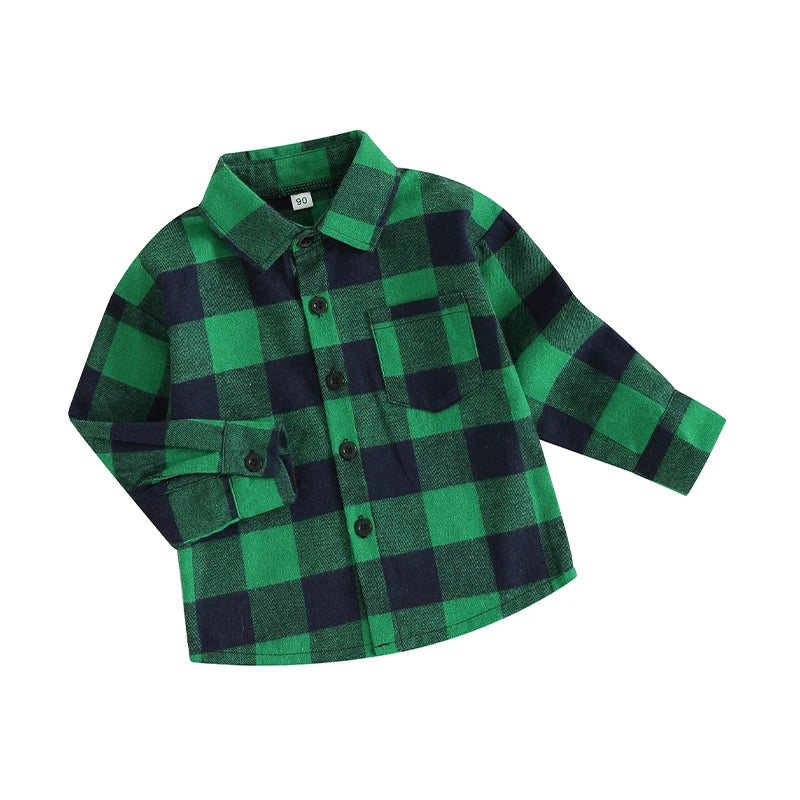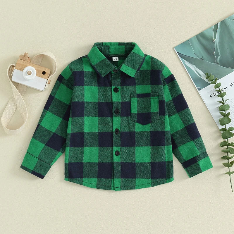 Keep your little boy stylish and cozy with our Toddler Baby Boys Jacket. This charming button-down top features long sleeves, a plaid pocket detail, and a flannel blouse shirt design, perfect for adding a touch of flair to his spring wardrobe.