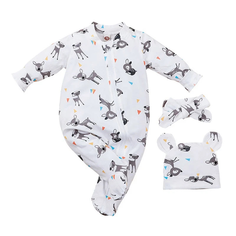 Baby Long Sleeve Cartoon Animal Print Rompers with Hat and Headband - 3-Piece Outfit Set