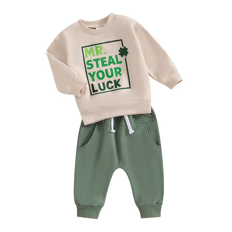 Dress your baby boy in festive style with our St. Patrick's Day Clothes Set. This adorable ensemble includes a long sleeve letter sweatshirt paired with elastic waist sweatpants, perfect for celebrating the holiday in comfort and style.