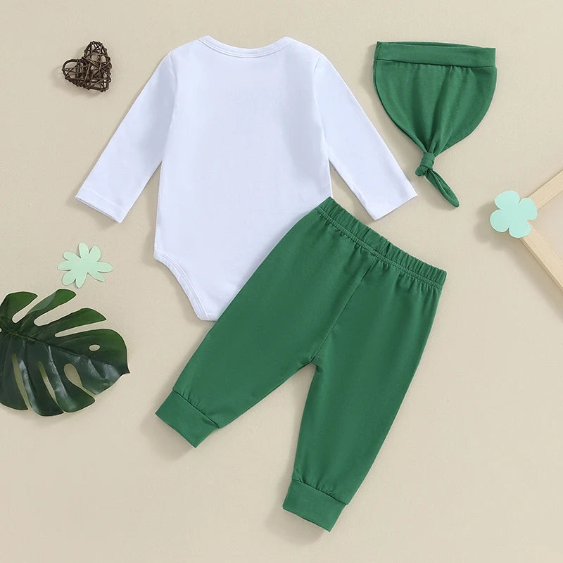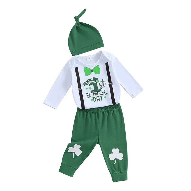 Dress your newborn baby boy in festive style with our St. Patrick's Day Outfit. This charming set includes shamrock print long sleeve rompers paired with elastic long pants and a matching beanie, perfect for celebrating the holiday in adorable comfort.