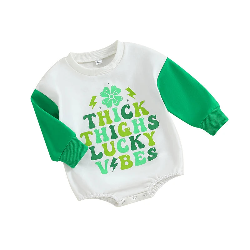 Dress your little one in festive style with our Newborn Baby Girls Boys St. Patrick's Day Romper. This adorable playsuit features a long sleeve crew neck design adorned with shamrock letter prints, perfect for celebrating the holiday in style.