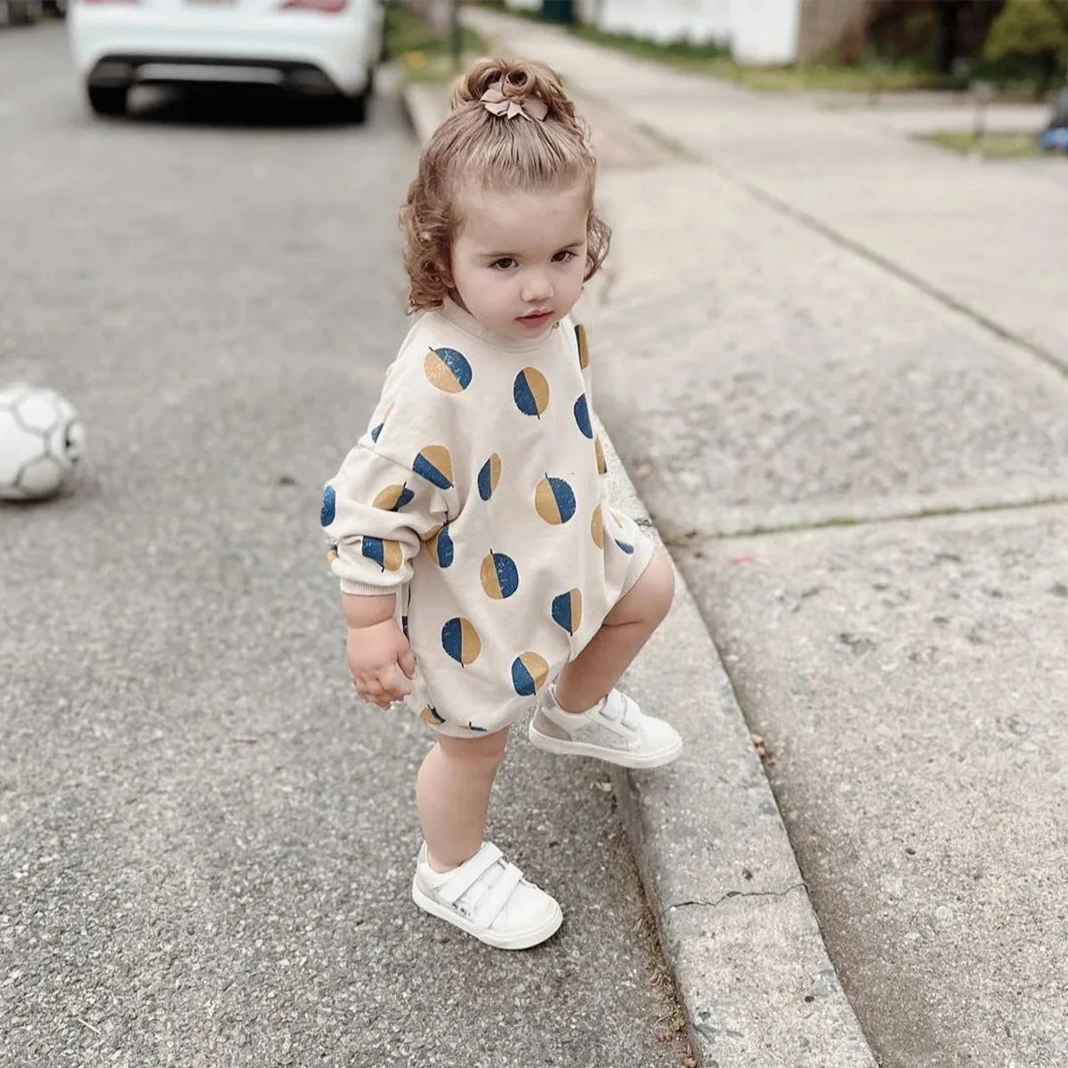 Designed for both baby girls and boys, this romper offers versatility and ease of wear. The loose fit allows for plenty of room for movement and growth, making it ideal for active babies. Whether it's playtime at home, outings with family, or a visit to the park, your baby will look cute and feel comfortable in this charming jumpsuit. The long sleeves provide added coverage against the chill, while the snap-button closure makes dressing and diaper changes a breeze.