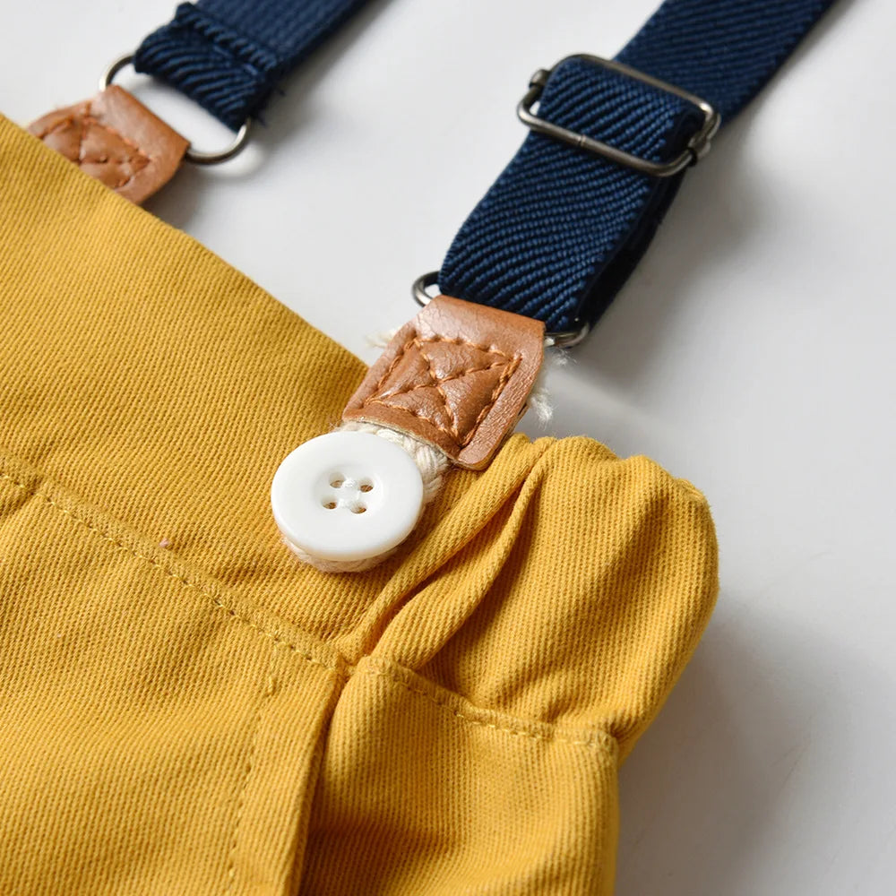 The plaid shirt adds a touch of sophistication with its classic pattern, while the included pants feature suspenders for an extra stylish look. Made from high-quality materials, this outfit is comfortable for your child to wear all day long.