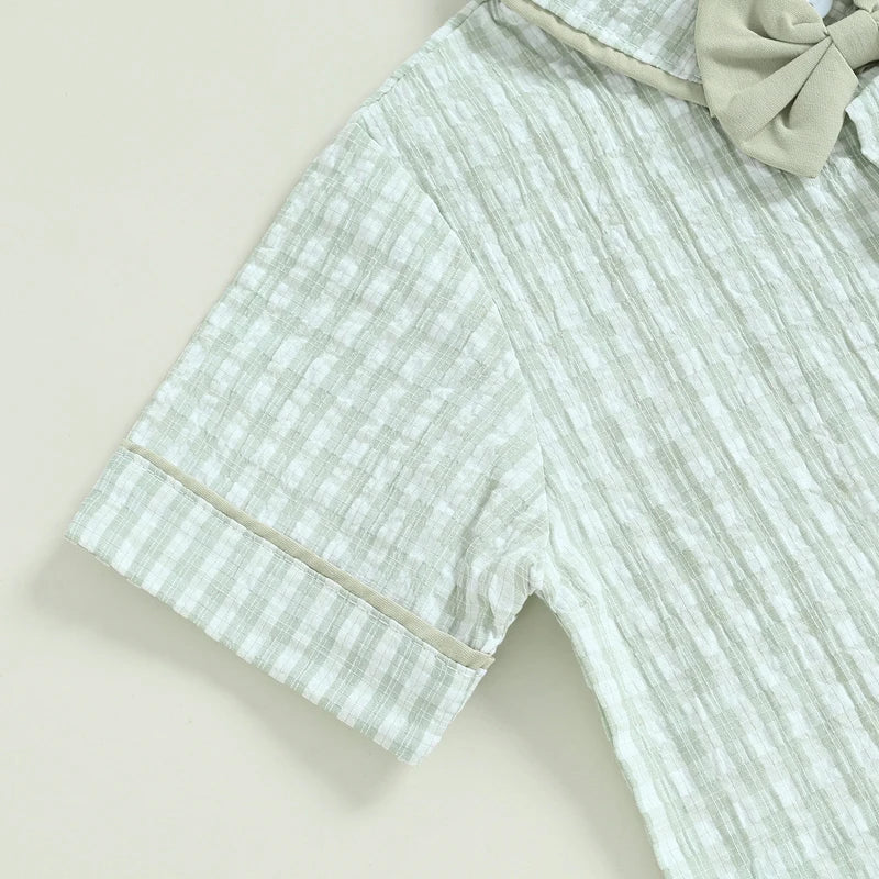 The plaid shirt features a classic turn-down collar and a charming bow-tie detail, adding an extra touch of sophistication to your little one's outfit. Made from soft and breathable materials, it ensures comfort throughout the day, whether for playtime or special occasions.