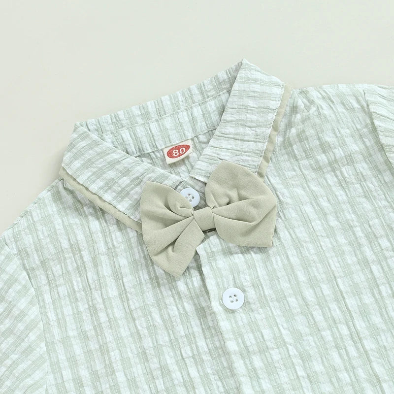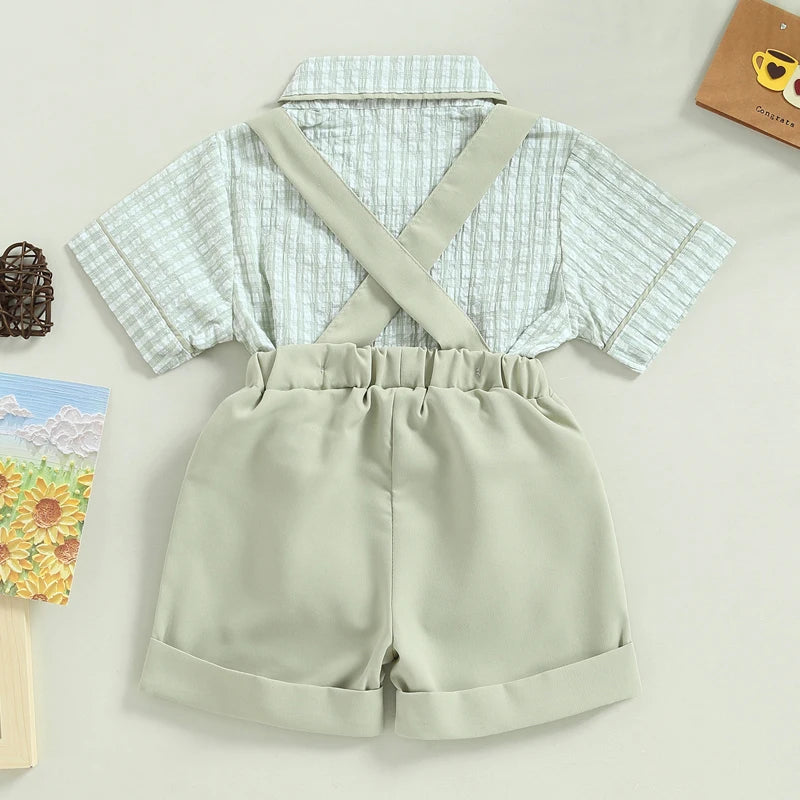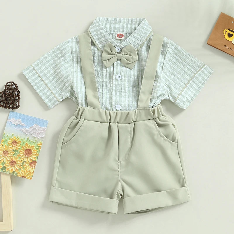 Dress your little gentleman in style with our Boys' Gentlemen Clothes Set. This charming ensemble includes a plaid short sleeve shirt with a turn-down collar and a striped shorts with straps, perfect for boys aged 0 to 4 years.