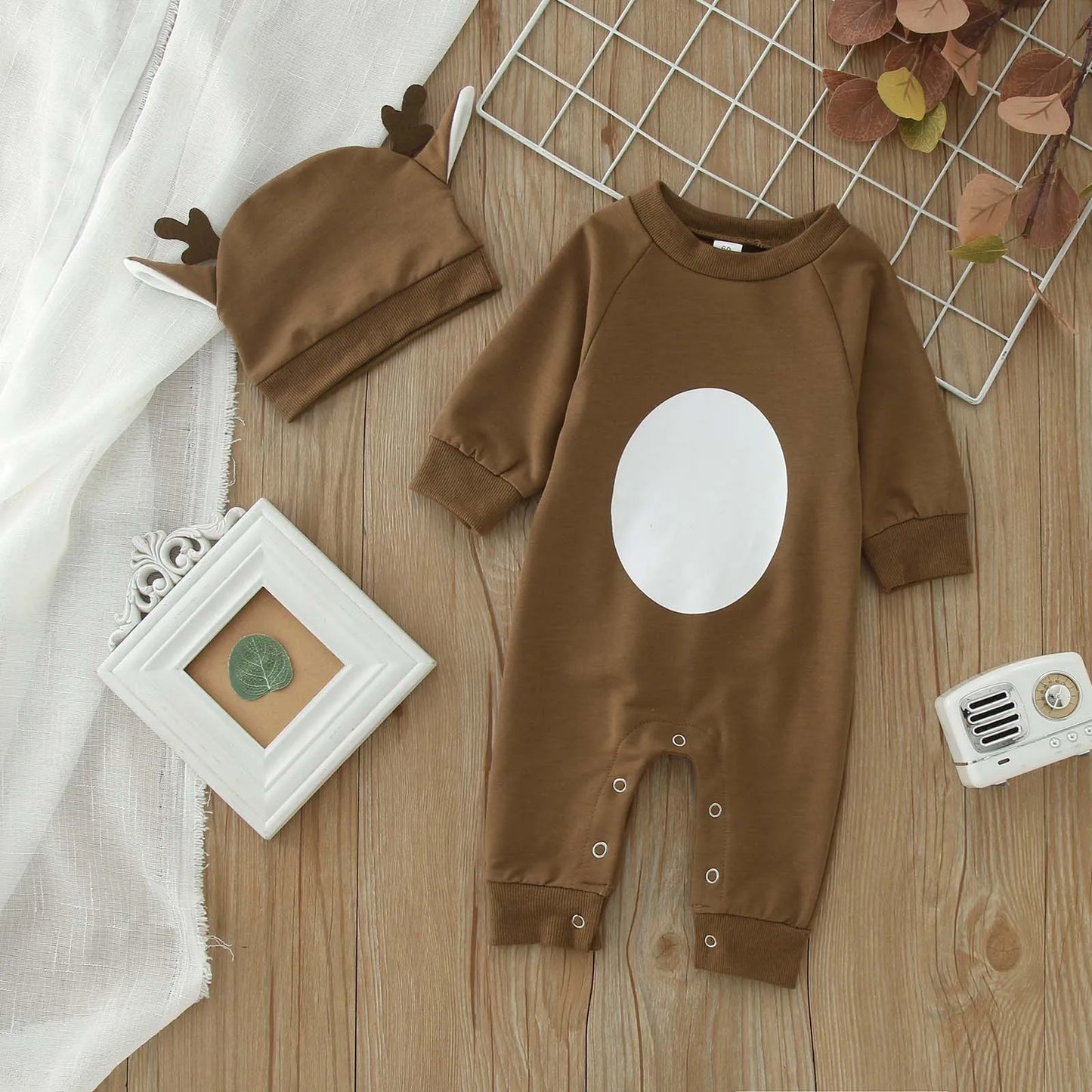 Christmas Newborn Baby Jumpsuit with Deer Romper and Hat - 2Pcs Outfit Set