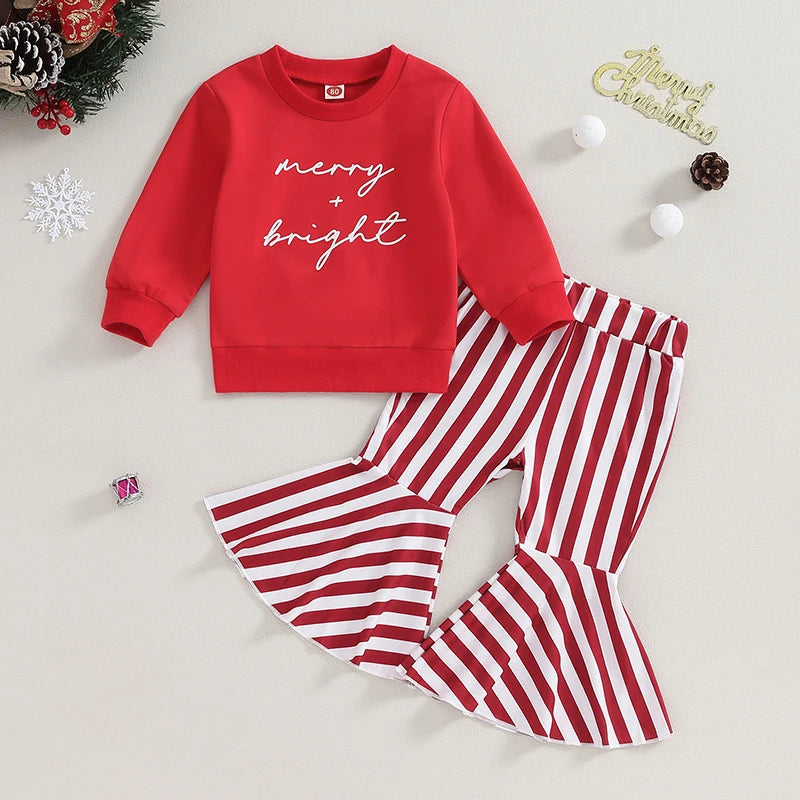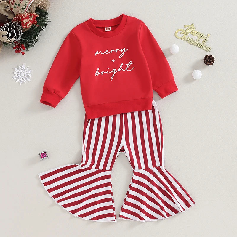 Christmas Outfit Long Sleeve Sweatshirt Striped Bell Bottom Flares Pants Set (6 Months - 4 Years)