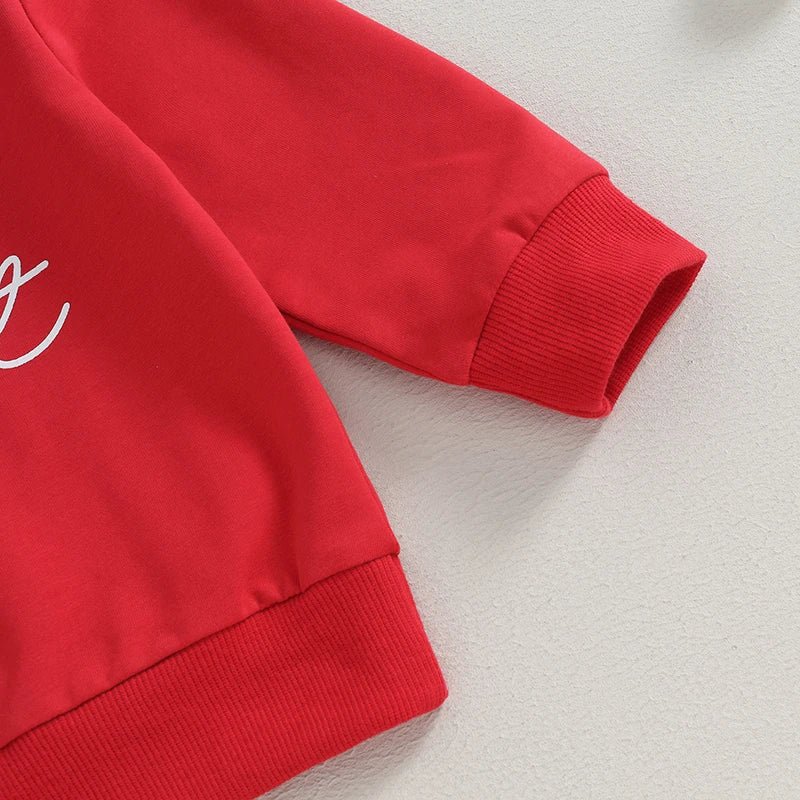 The long sleeve sweatshirt features a playful letter print, adding a touch of whimsy to her holiday look. Paired with striped bell bottom flares pants, this set exudes retro charm with a modern twist. Whether she's attending family gatherings or posing for holiday photos, she'll look irresistibly cute in this outfit.