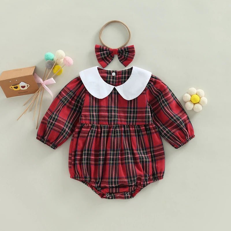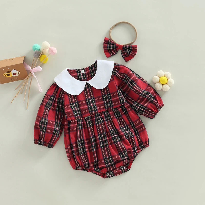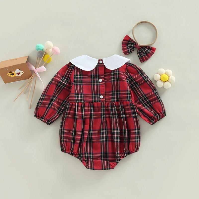 Christmas Romper Long Sleeve Plaid Casual Fall Spring Short Jumpsuit with Headband Outfit (0-24 Months)