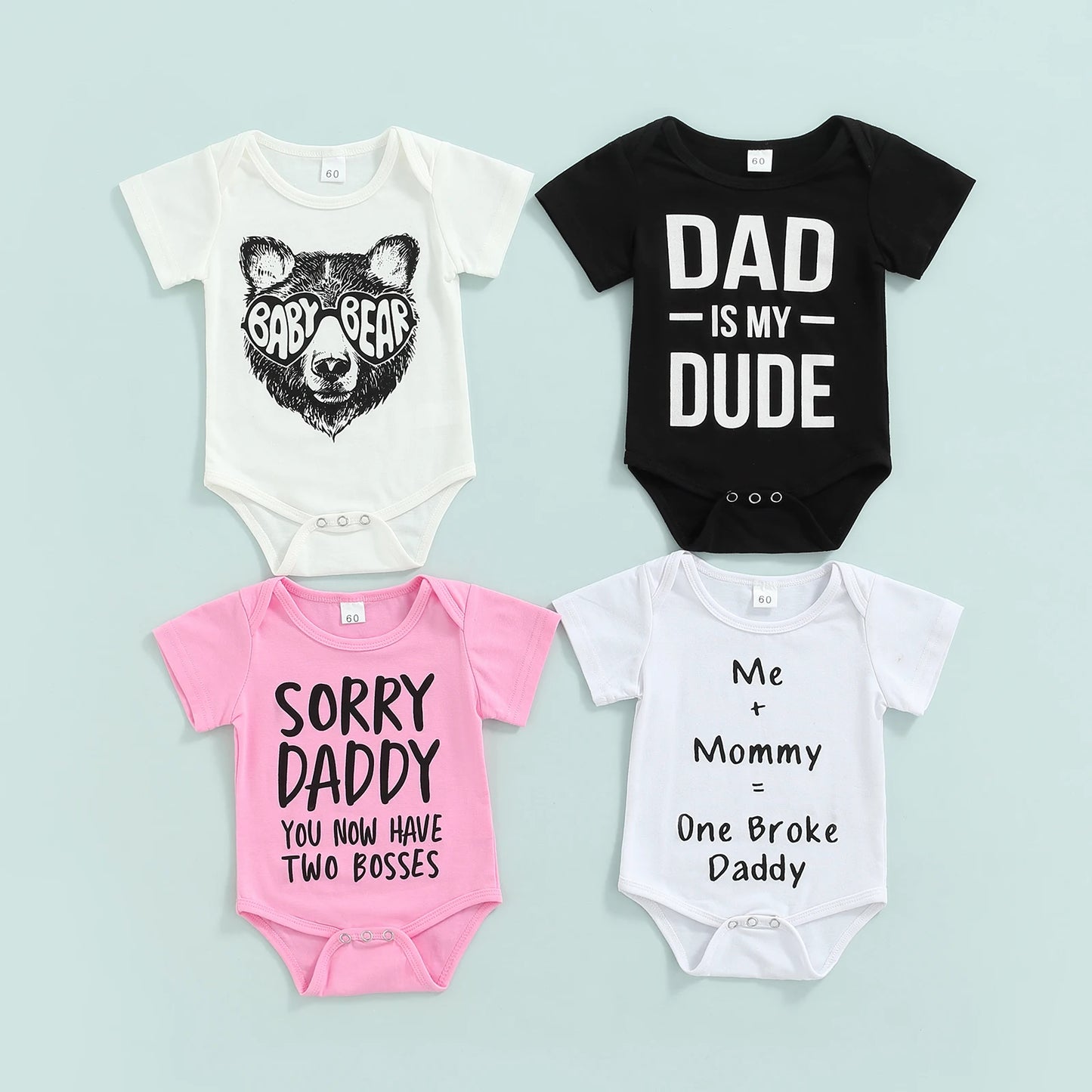 Cotton Bodysuit Short Sleeve O Neck Playsuit with Letter/Bear Head Print