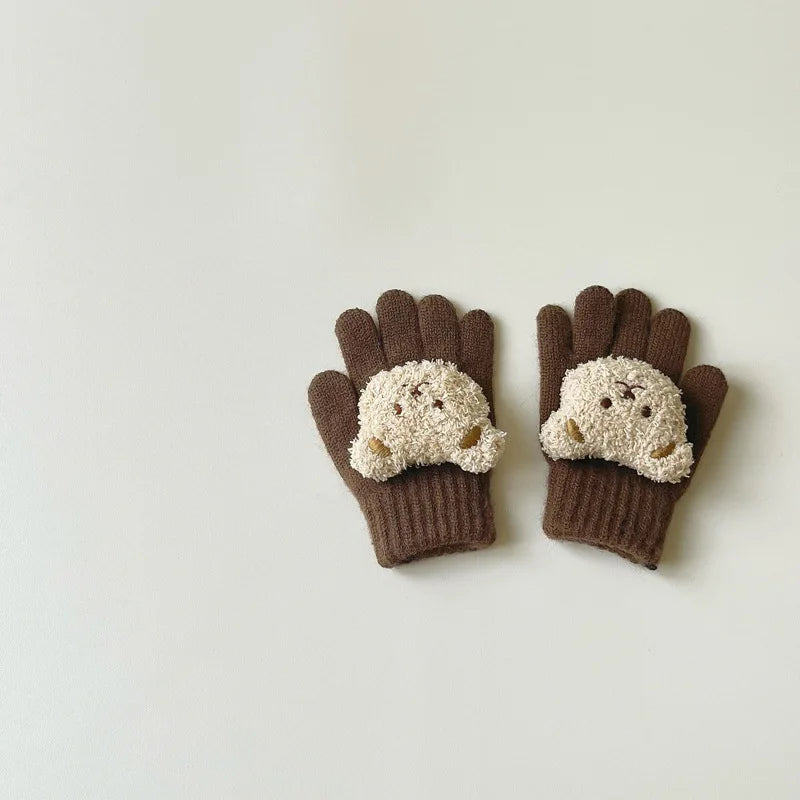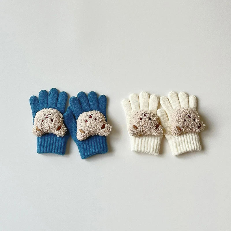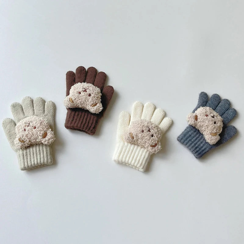 Cute Cartoon Bear Kids Winter Knitted Wool Gloves - Full Finger Warm Mittens