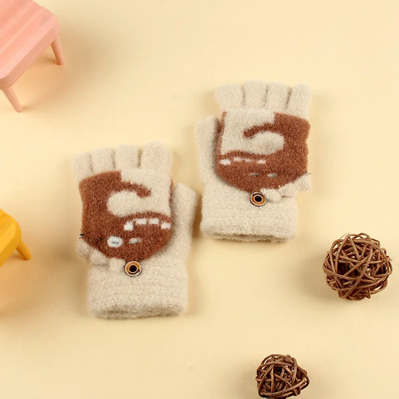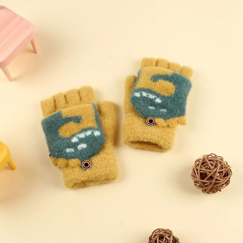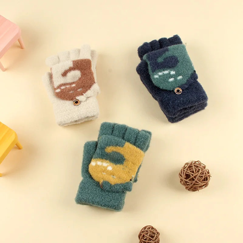 Cute Cartoon Dinosaur Flip Half Finger Gloves - Plush Thick Warm Gloves for Children
