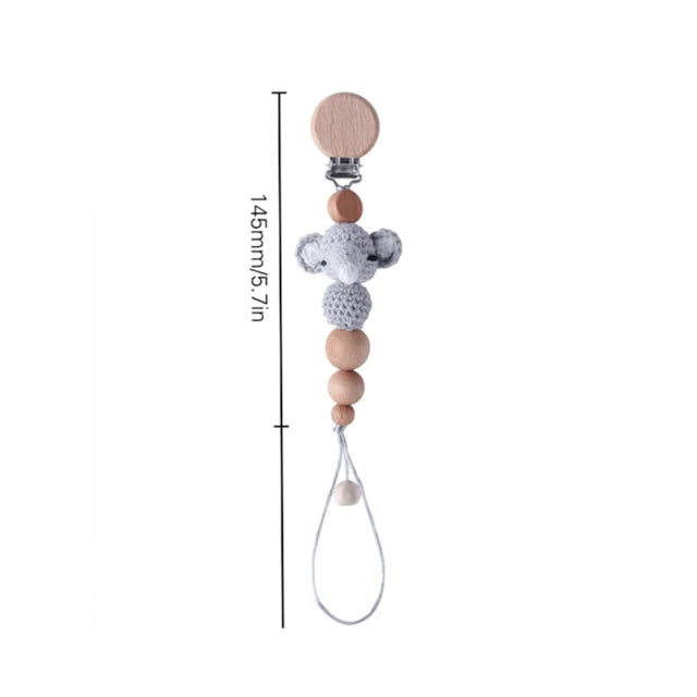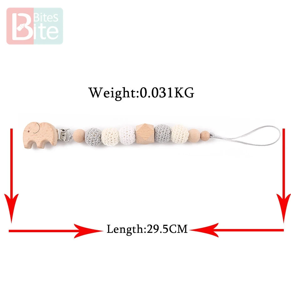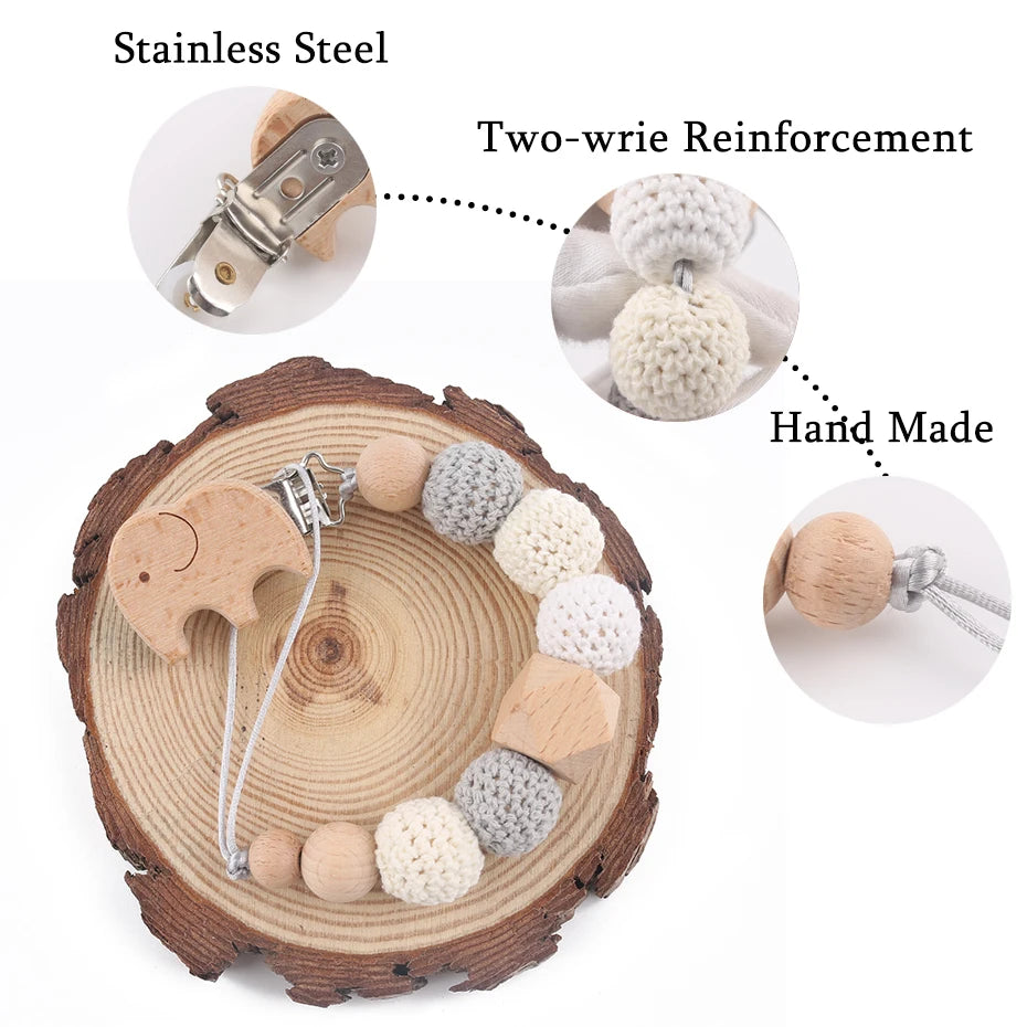 Elephant Wooden Clip Baby Pacifier Chain - Geometric Crochet Beads, Wood Teether, Dummy Clips, Pacifier Holder