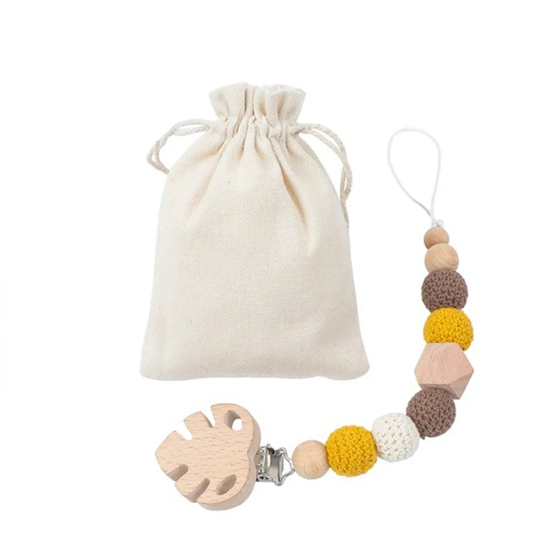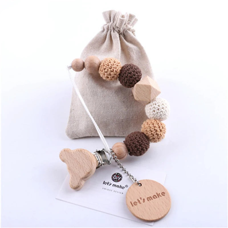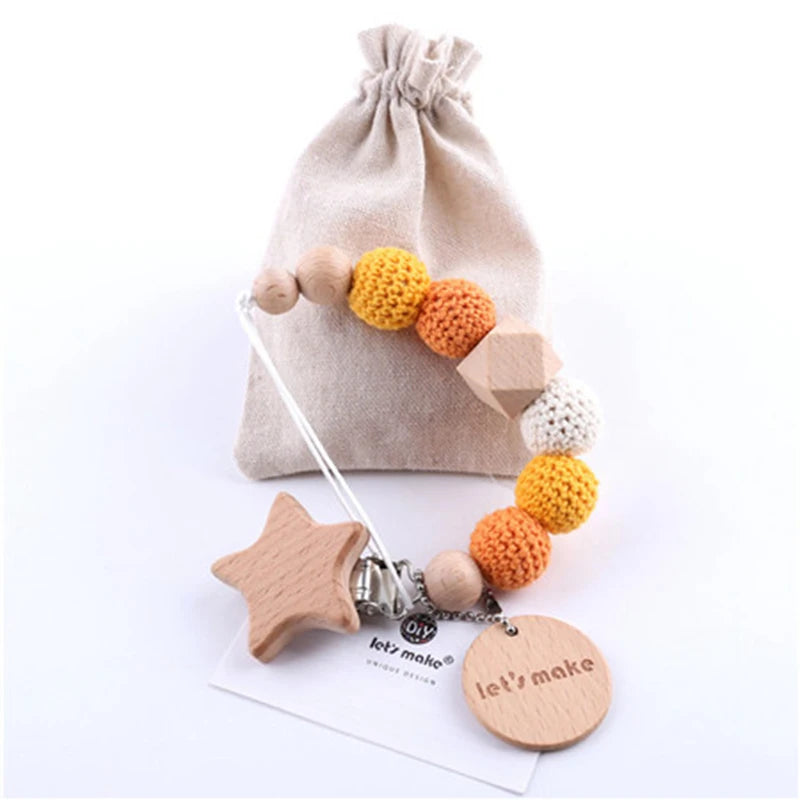 The wooden clip securely attaches to your baby's clothing or diaper bag, ensuring the pacifier stays within reach and off the ground. The crochet beads provide tactile stimulation and relief for teething babies, while the wood teether offers a safe and natural chewing option.