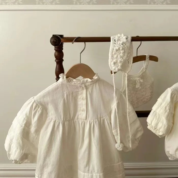 Dress your little girl in charming style with our Girl Solid Puff Sleeves Bodysuit. Perfect for springtime adventures, this cute jumpsuit features a lace-up collar design that adds a touch of elegance to her outfit.