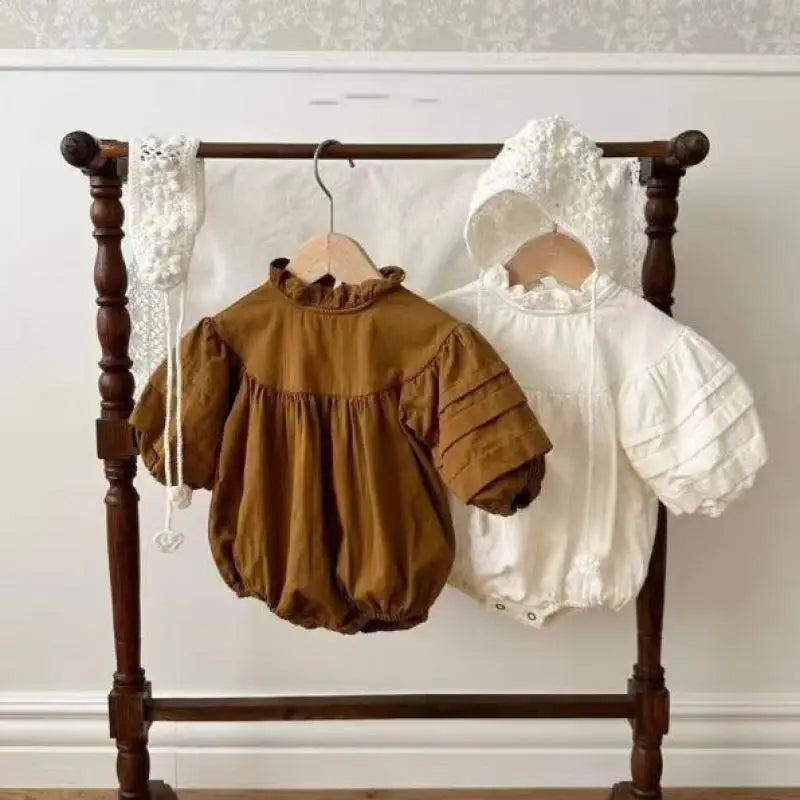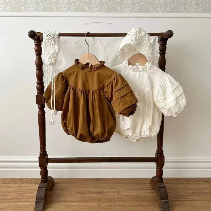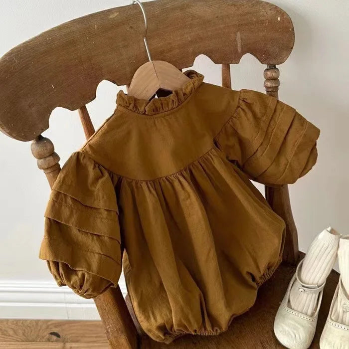 Girl Solid Puff Sleeves Bodysuit - Spring Lace-up Collar Jumpsuit